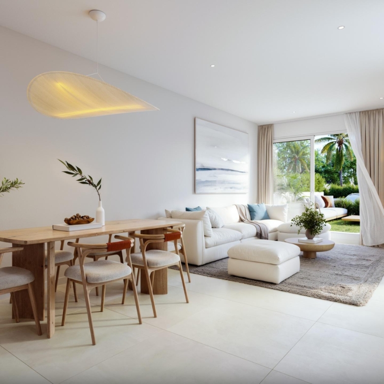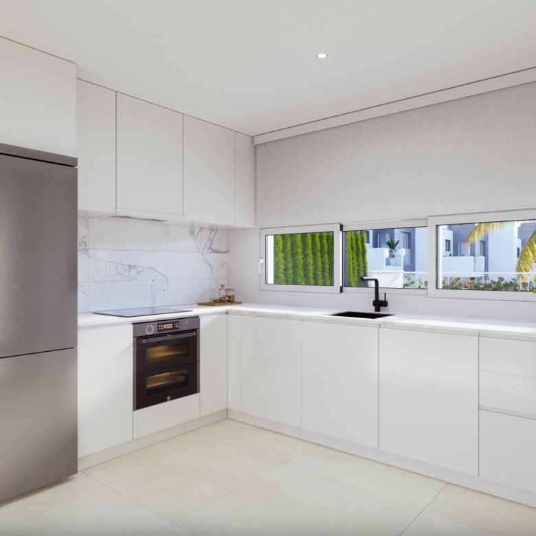 Erdgeschoss: Offene Räume mit einer voll integrierten modernen Küche, einem hellen Wohn-Esszimmer und direktem Zugang zu einer privaten Veranda und einem Garten. Der Garten geht nahtlos in den gemeinschaftlichen Pool über. Ein Gästebad ist ebenfalls vorhanden.