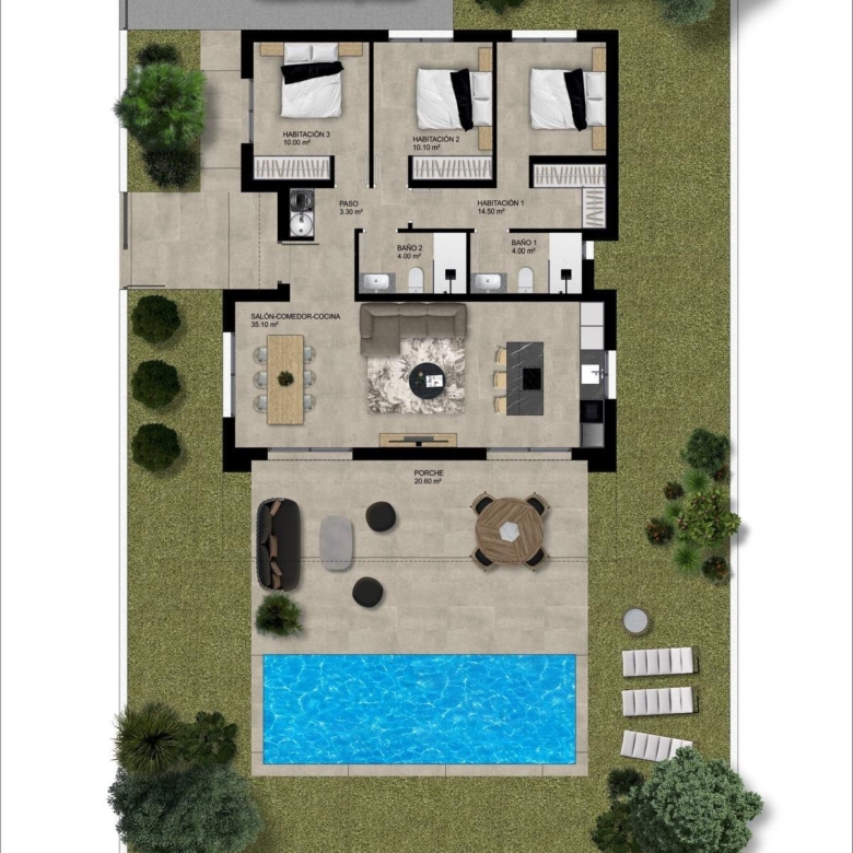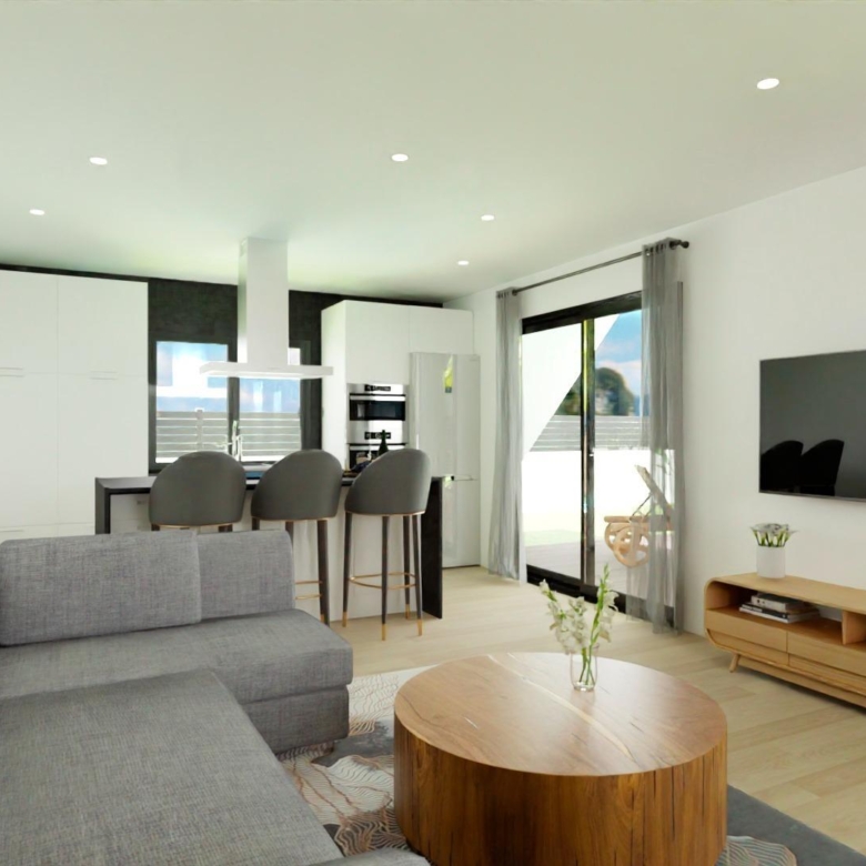 Tagesbereich: Hier finden wir ein großes Wohn-Esszimmer mit offener Küche (Küchenmöbel inbegriffen), das durch seine zwei großen Fenster mit der großen Veranda mit modernem Charakter verbunden ist, die zum Gartenbereich und, warum nicht… zum Pool führt. Als zusätzlicher Raum hat es eine Waschküche, die strategisch in der Verteilung des Hauses platziert ist, wo sie sehr leicht von überall im Haus zugänglich ist.