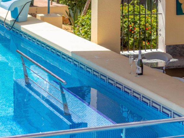 Draußen ist das Anwesen von gepflegten Gärten und Terrassen umgeben. Die Poolterrasse ist flach und nach Süden ausgerichtet und beherbergt einen großen beheizten Pool mit Kinderbereich und eine Poolbar. Es gibt eine große Einfahrt mit ausreichend Parkplätzen für viele Autos.