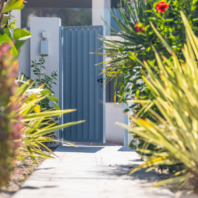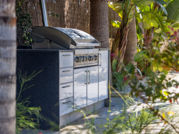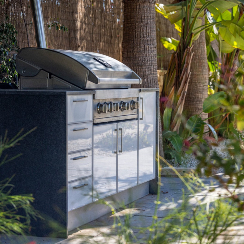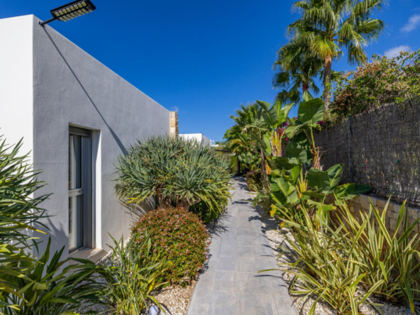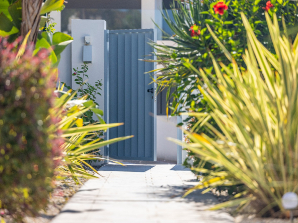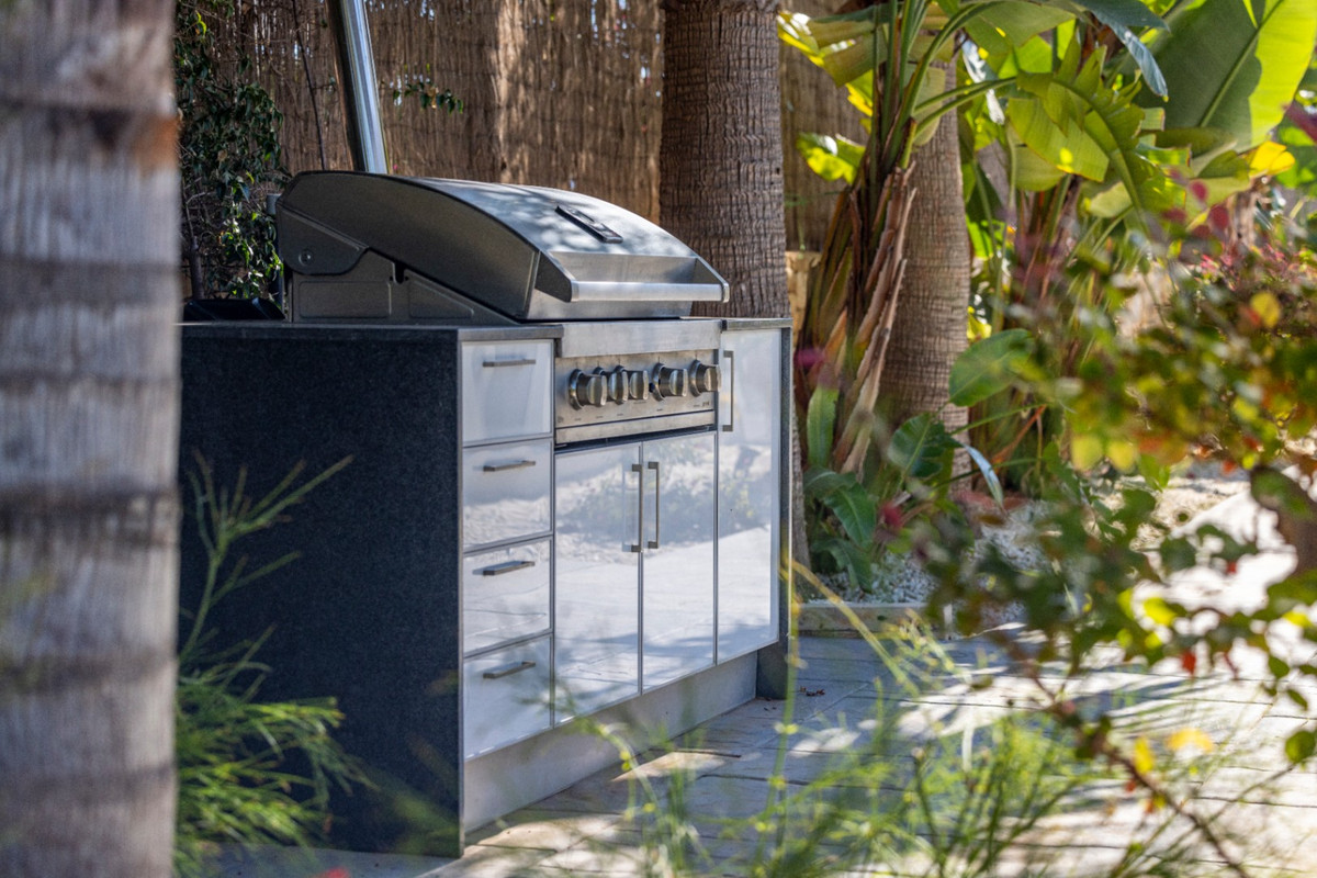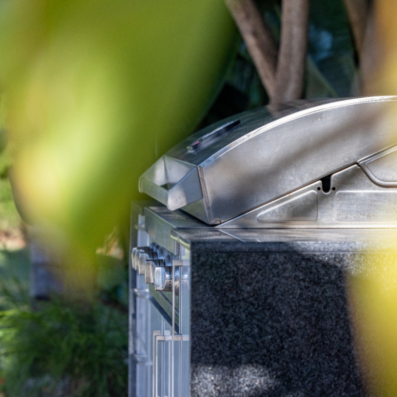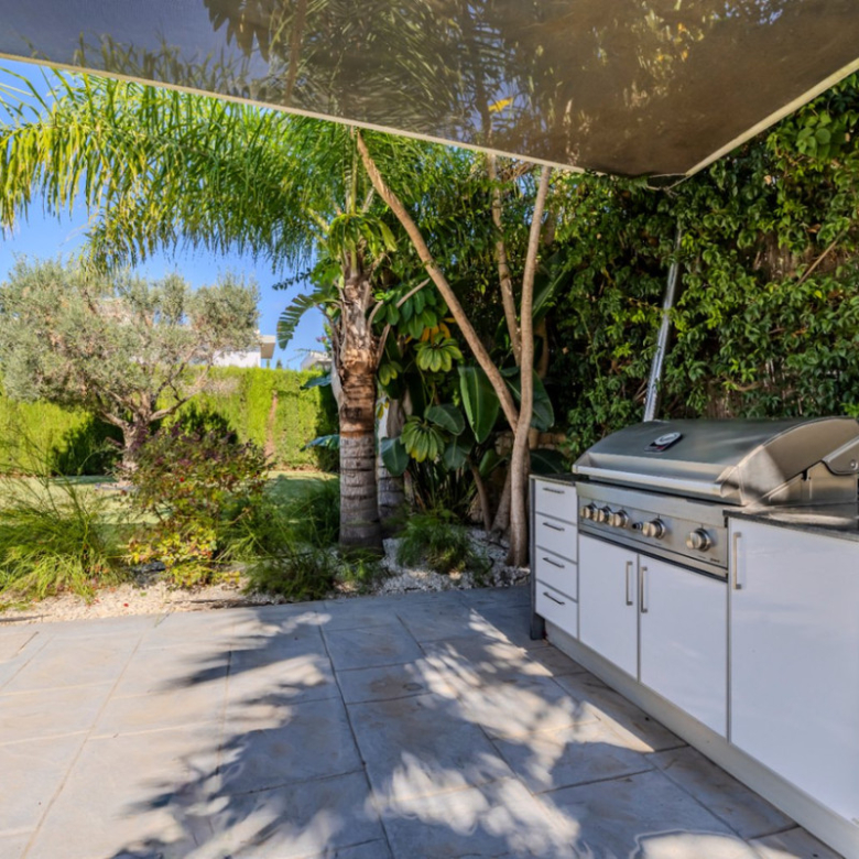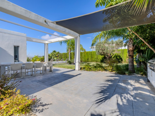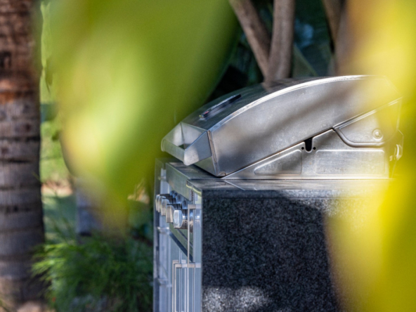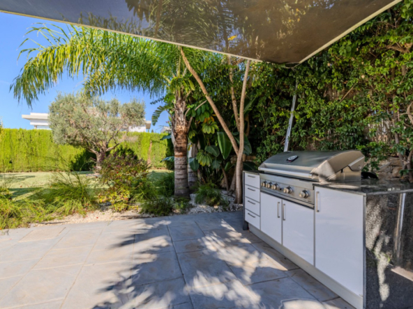 Der Garten umfasst einen privaten Unterhaltungsbereich mit Grill, umgeben von gepflegten Anlageflächen, die Privatsphäre garantieren.