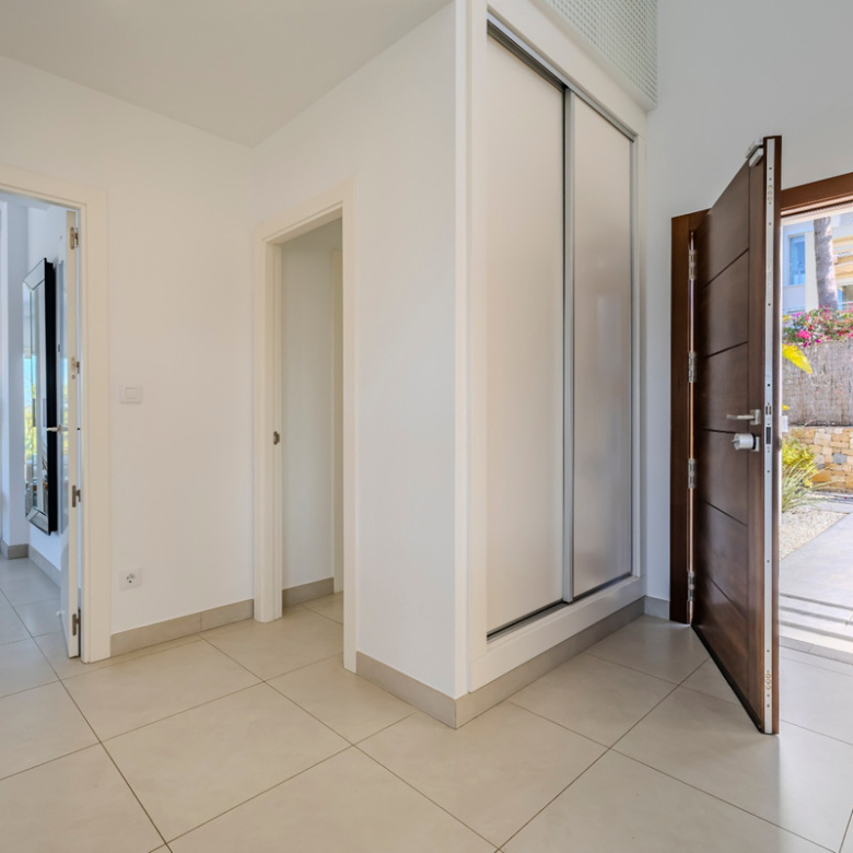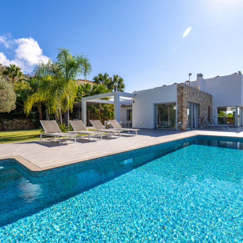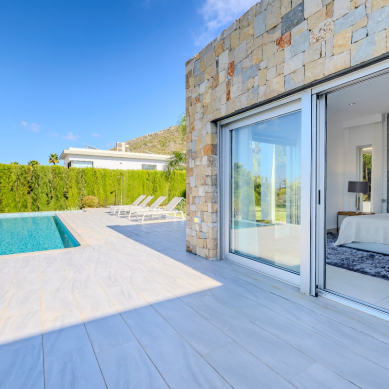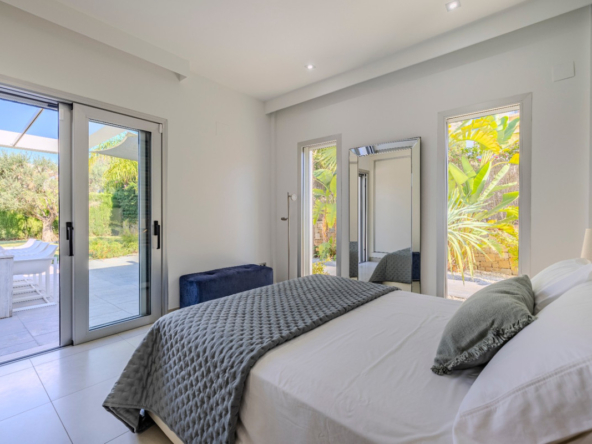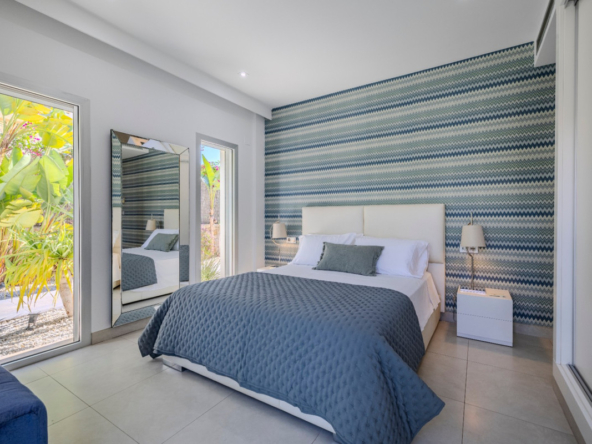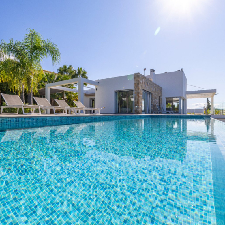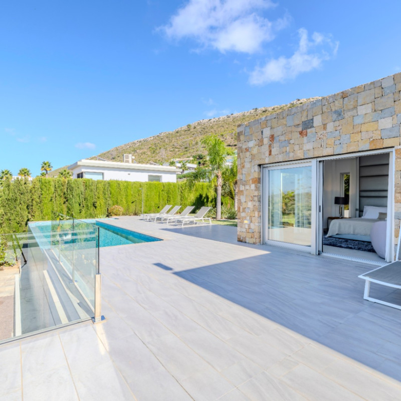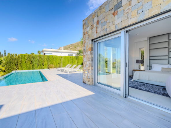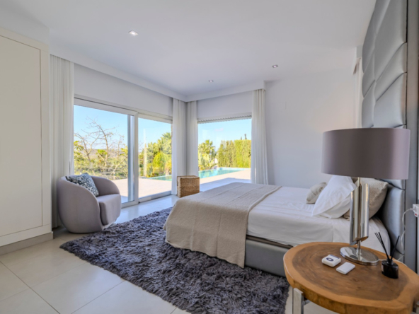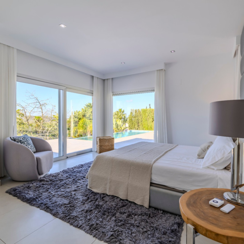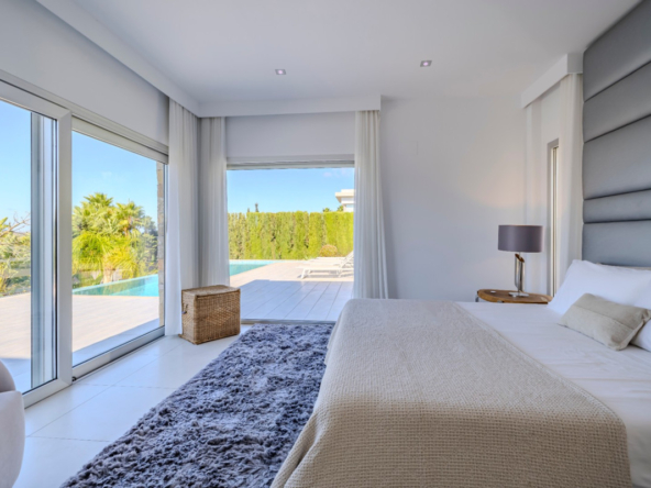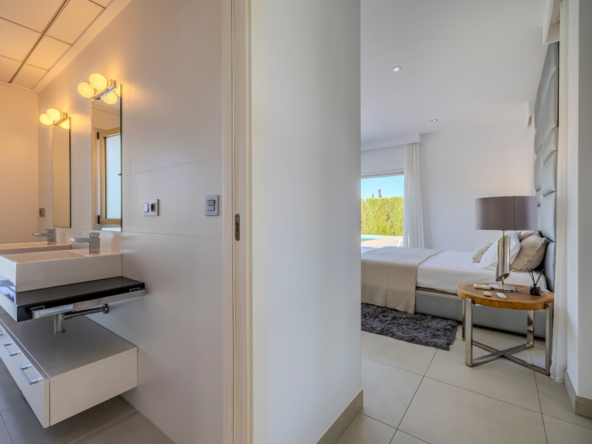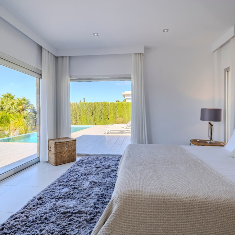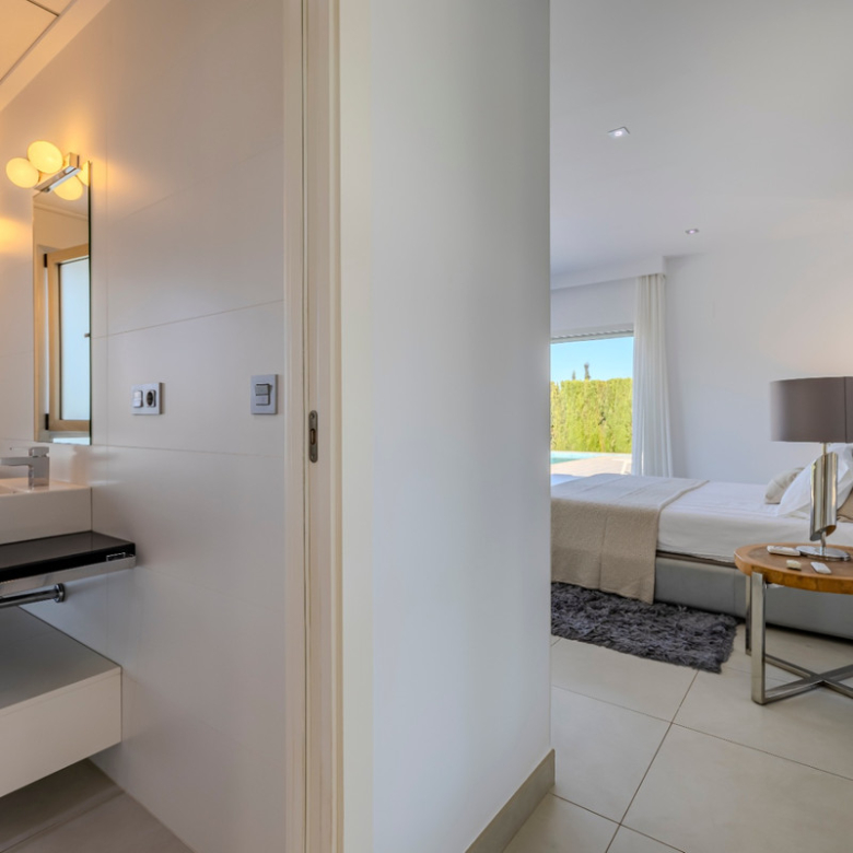 Die Hauptetage verfügt über einen hellen, offenen Grundriss mit einer modernen Küche, Wohn- und Essbereichen, die sich über große Glastüren direkt zur Poolterrasse öffnen und dadurch viel Tageslicht hereinlassen. Auf dieser Ebene gibt es auch drei geräumige Schlafzimmer, alle mit eigenen Badezimmern und einem Garderobenraum.