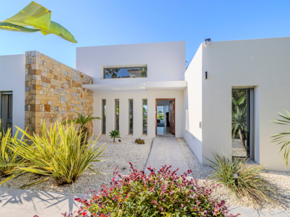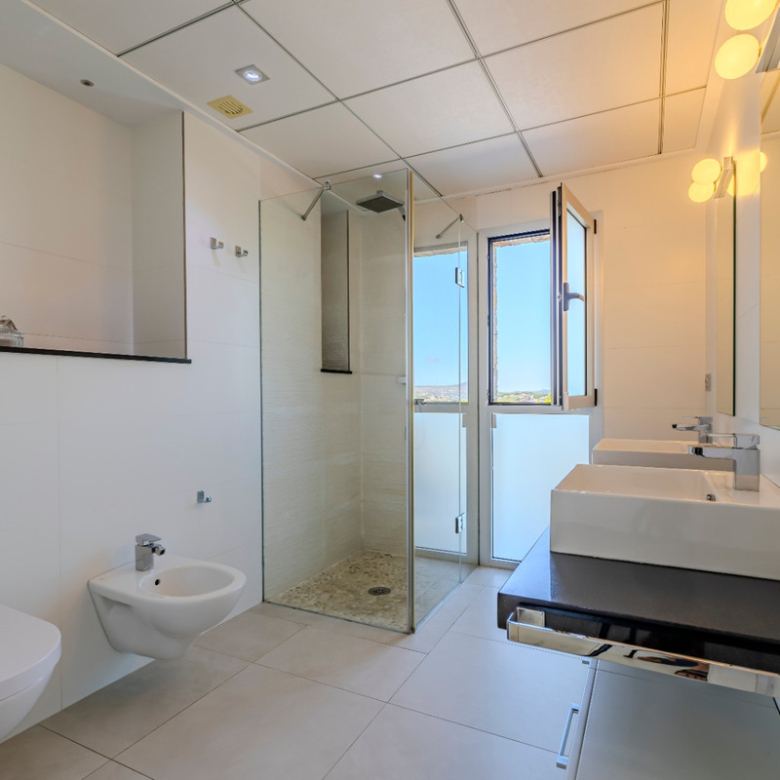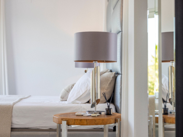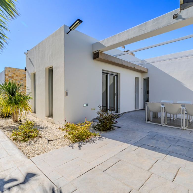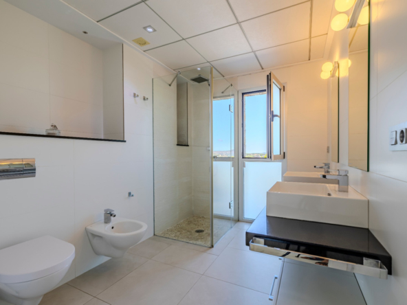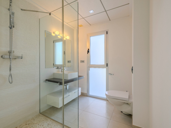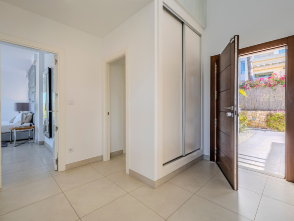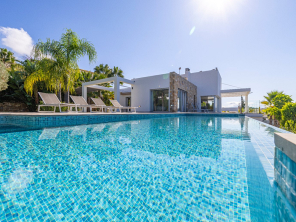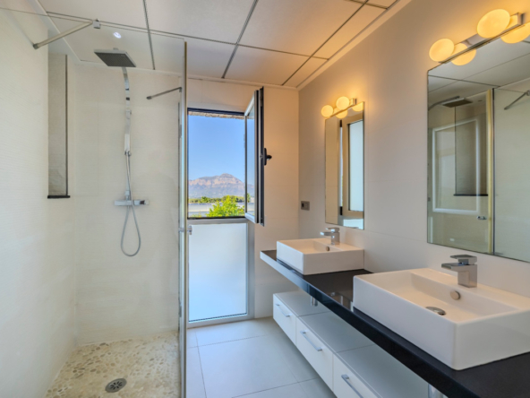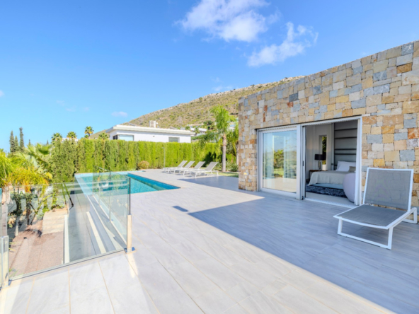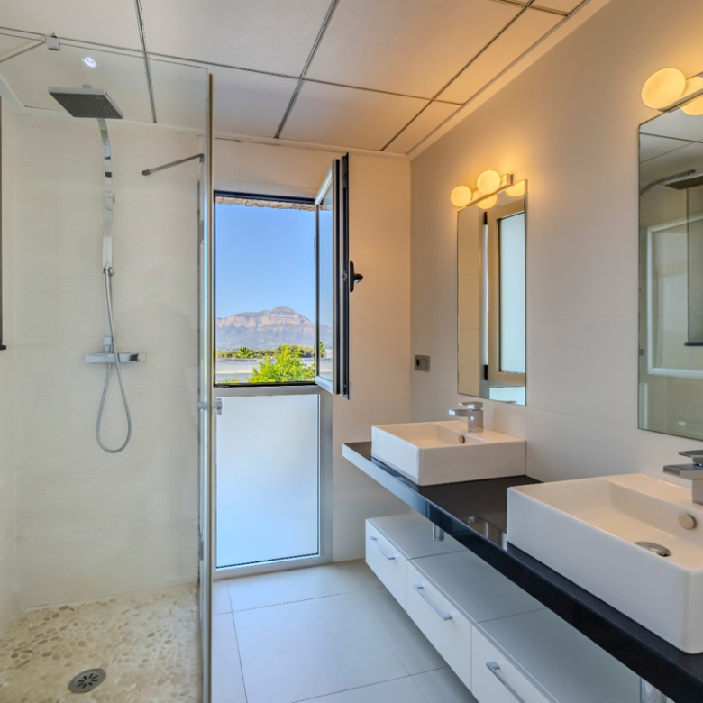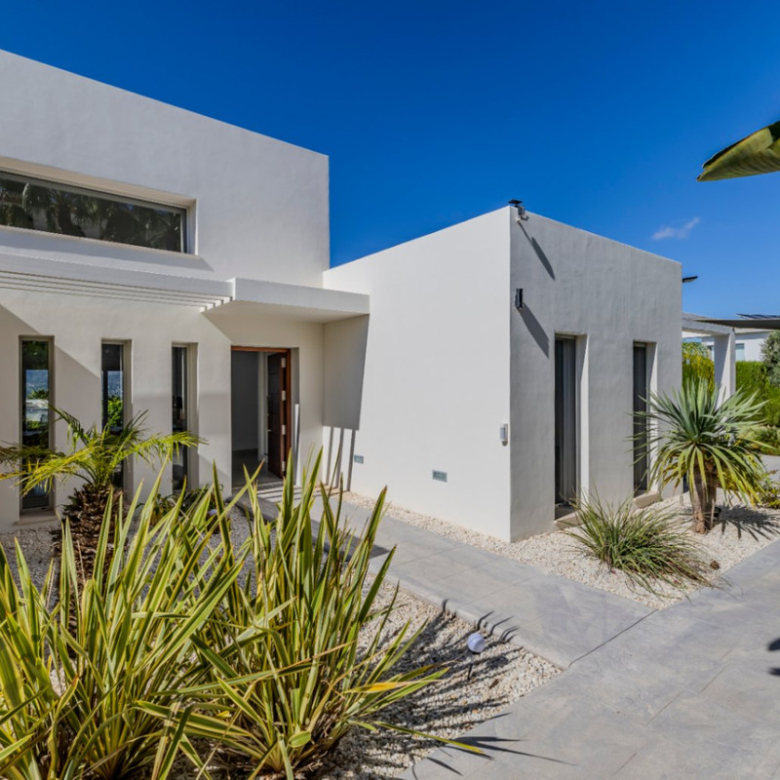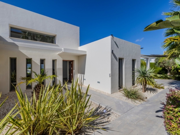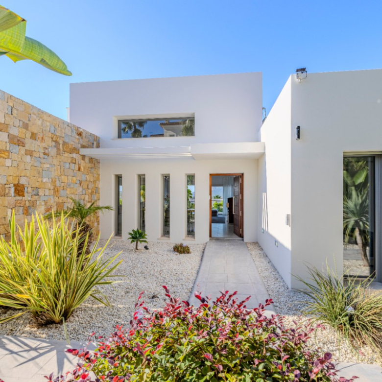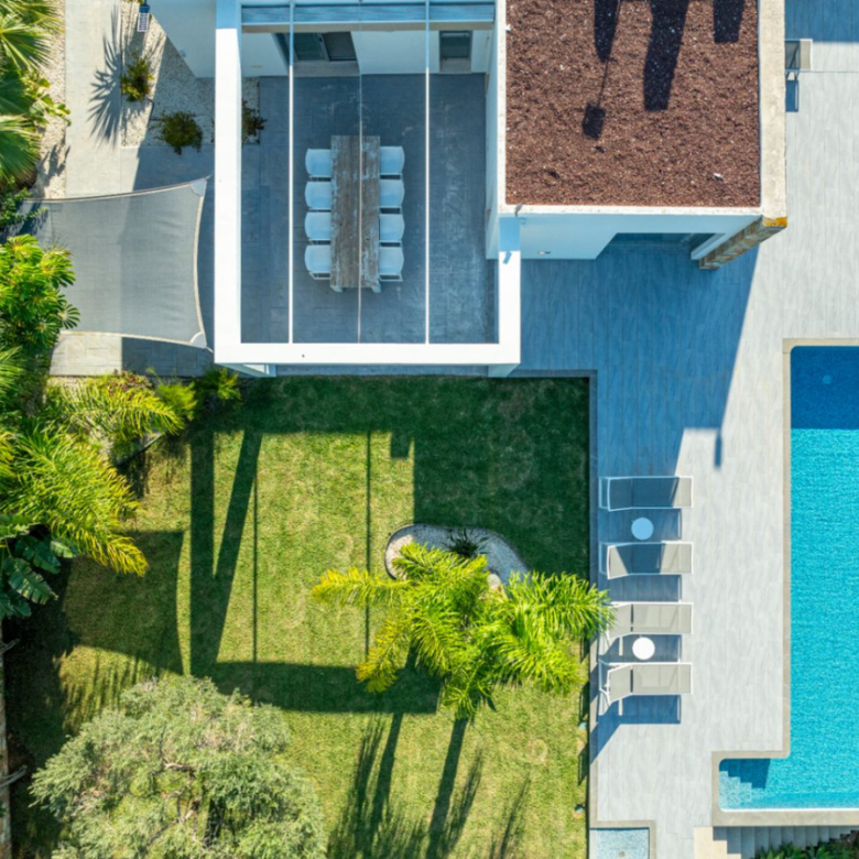 Die Hauptetage verfügt über einen hellen, offenen Grundriss mit einer modernen Küche, Wohn- und Essbereichen, die sich über große Glastüren direkt zur Poolterrasse öffnen und dadurch viel Tageslicht hereinlassen. Auf dieser Ebene gibt es auch drei geräumige Schlafzimmer, alle mit eigenen Badezimmern und einem Garderobenraum.