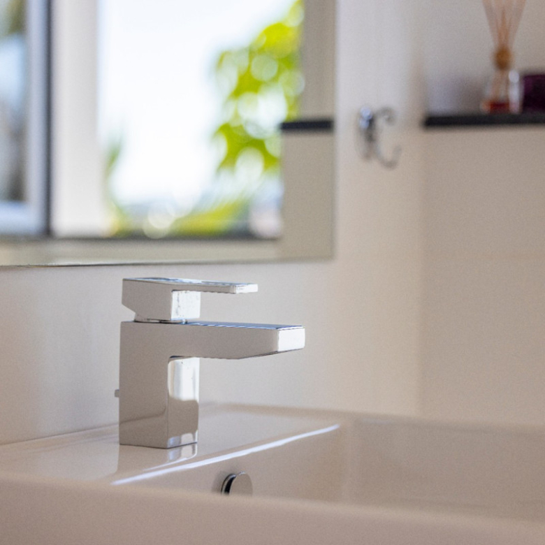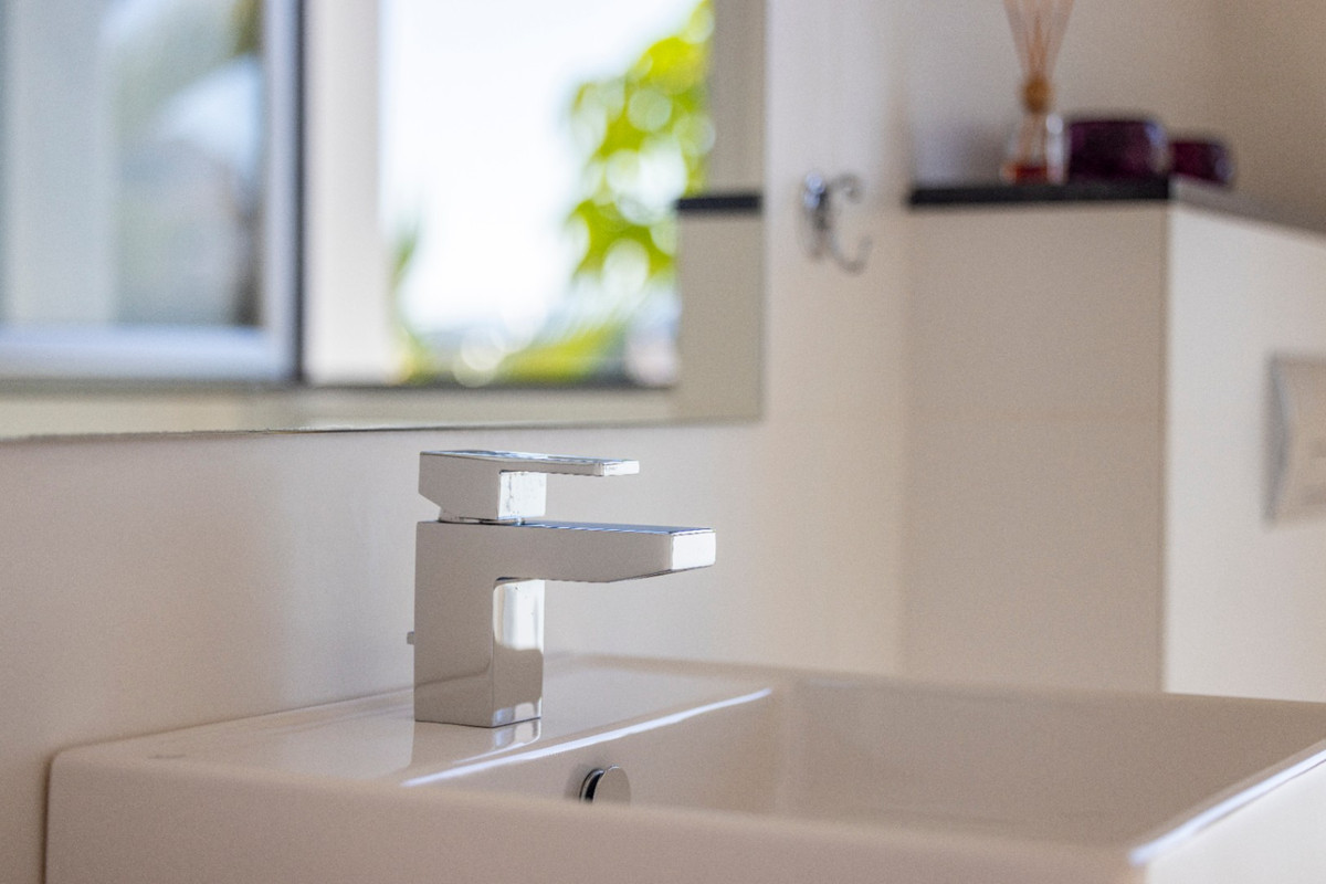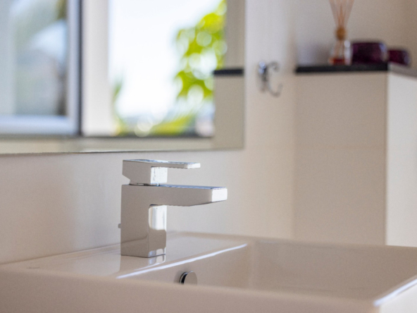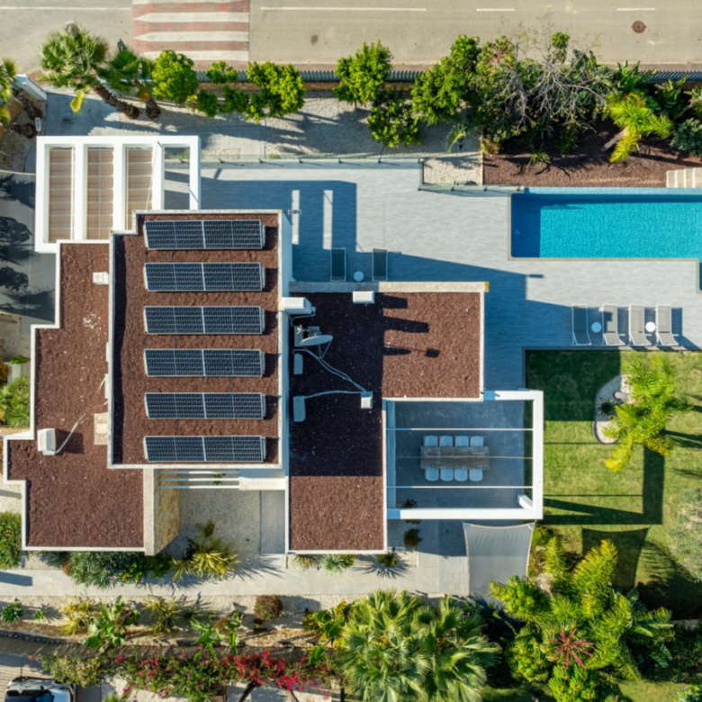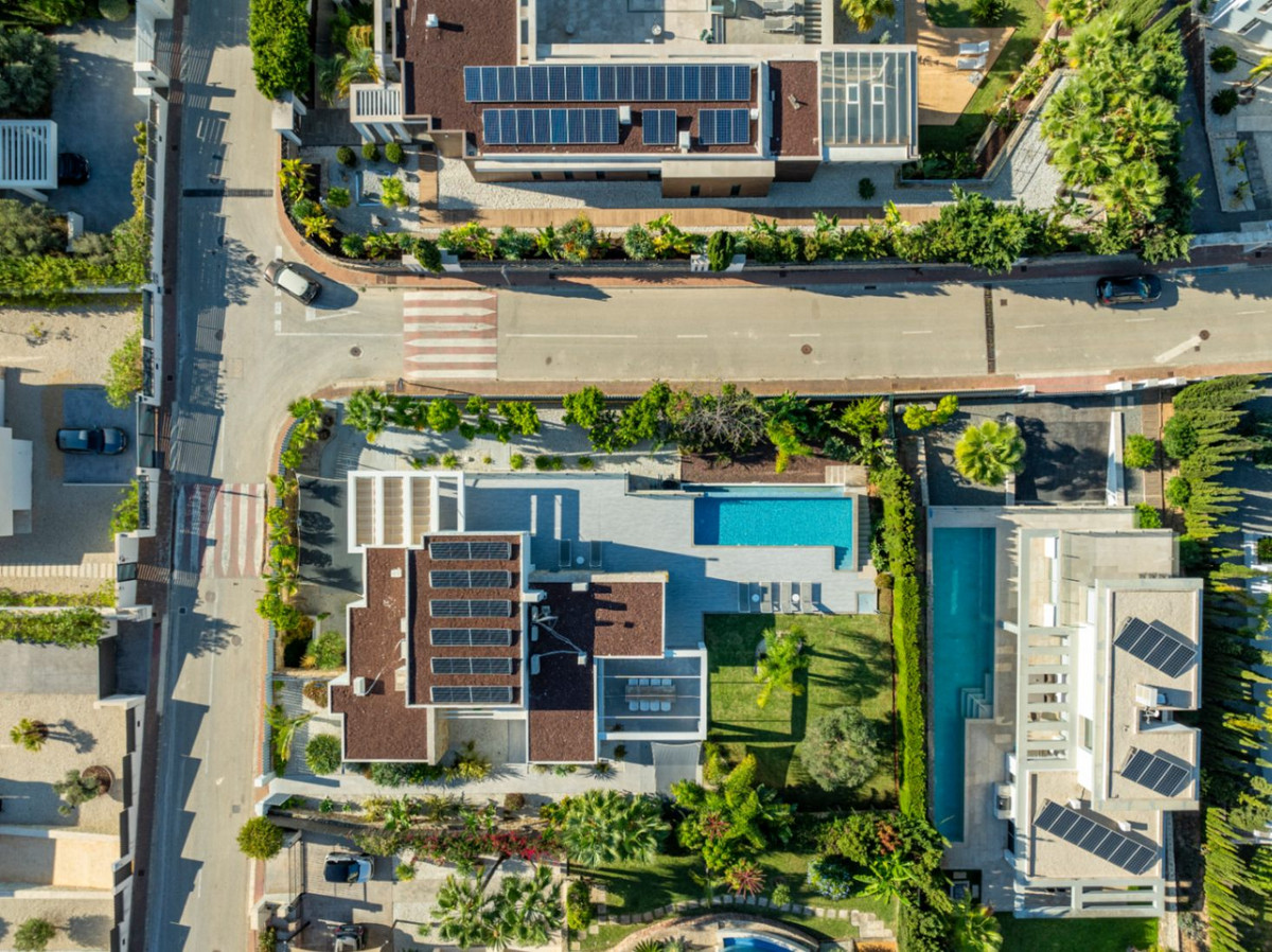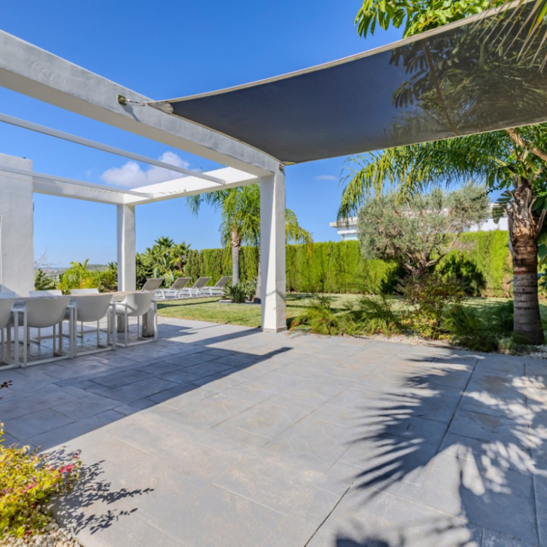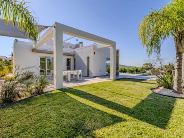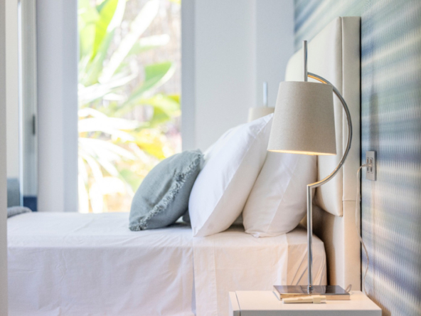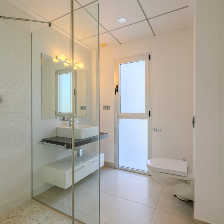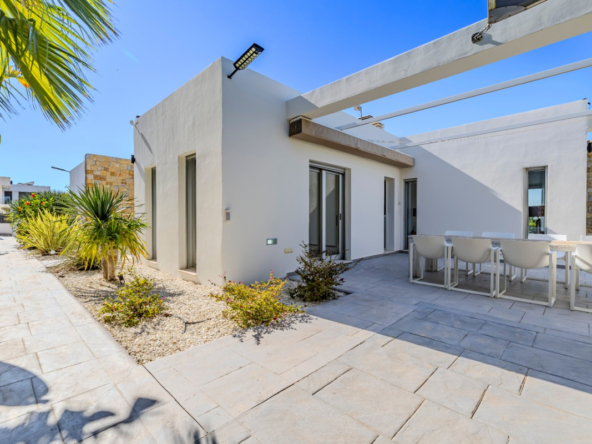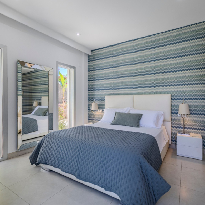 Die Hauptetage verfügt über einen hellen, offenen Grundriss mit einer modernen Küche, Wohn- und Essbereichen, die sich über große Glastüren direkt zur Poolterrasse öffnen und dadurch viel Tageslicht hereinlassen. Auf dieser Ebene gibt es auch drei geräumige Schlafzimmer, alle mit eigenen Badezimmern und einem Garderobenraum.