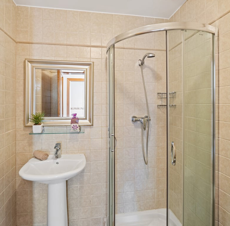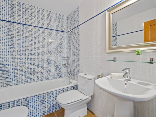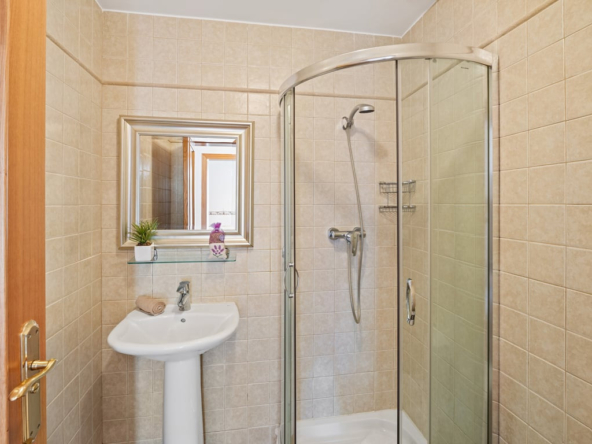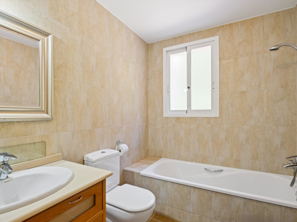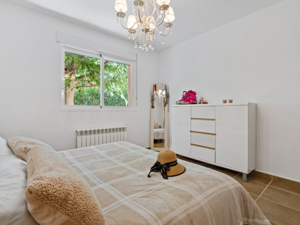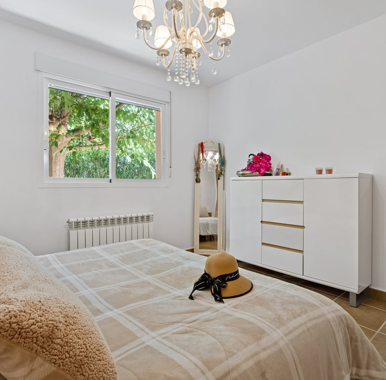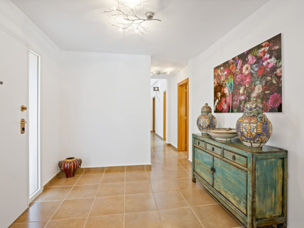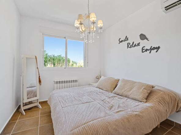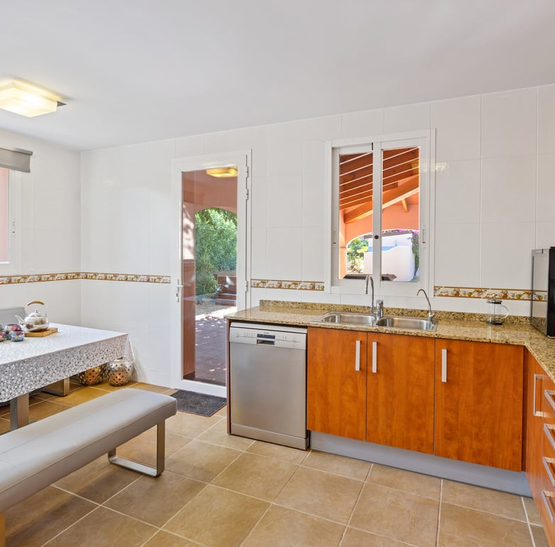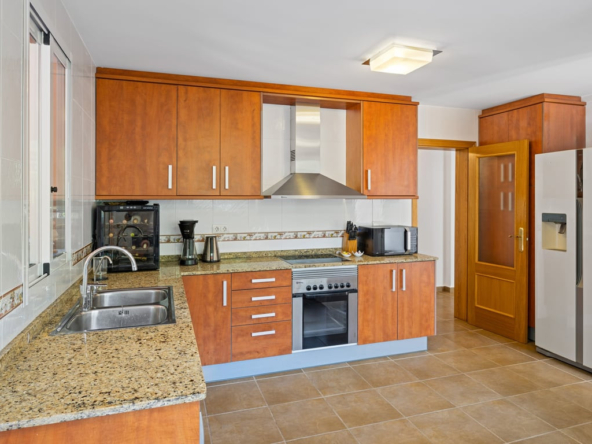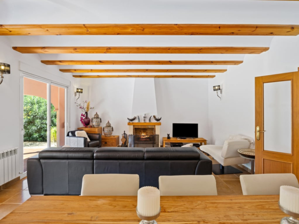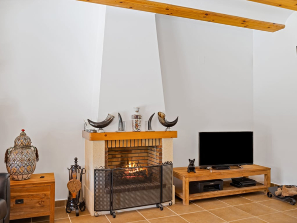 Die Immobilie verfügt über vier Schlafzimmer, drei Badezimmer, ein helles Wohnzimmer mit Kamin sowie eine voll ausgestattete L-förmige Küche mit amerikanischem Kühlschrank, Frühstücksecke, Außentür und Hauswirtschaftsraum. Komfort durch Split-Klimaanlage, Gaszentralheizung, Doppelverglasung, Rollläden und Einbauschränke.