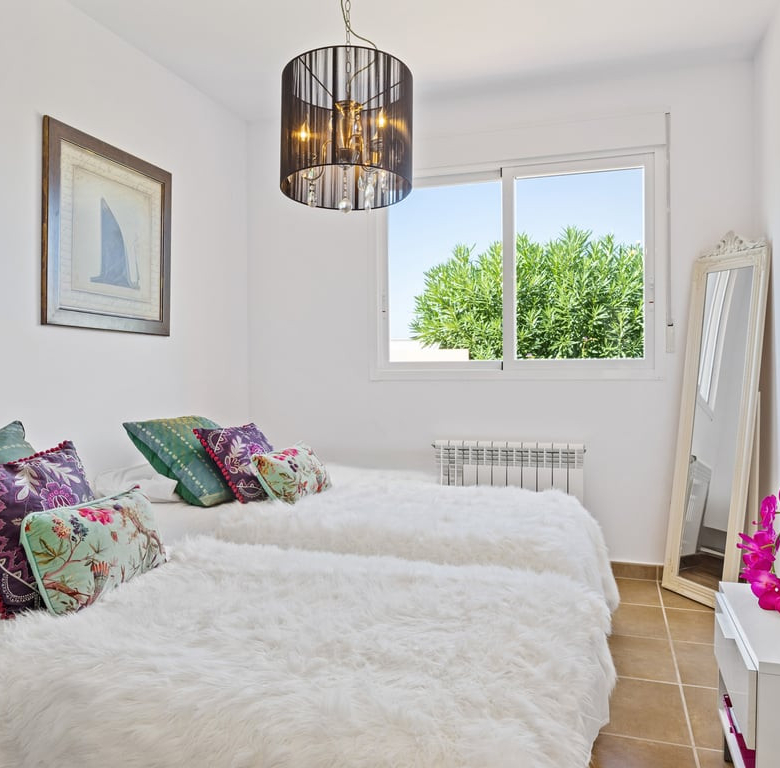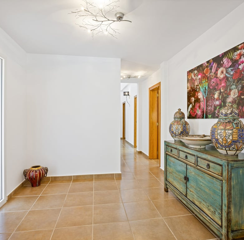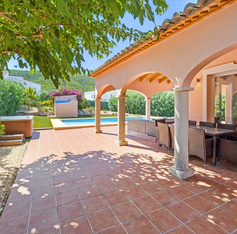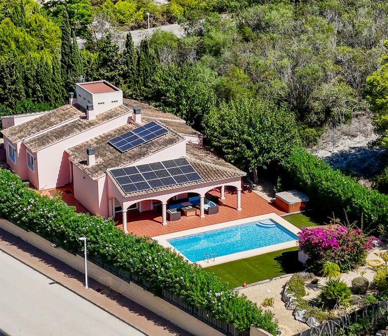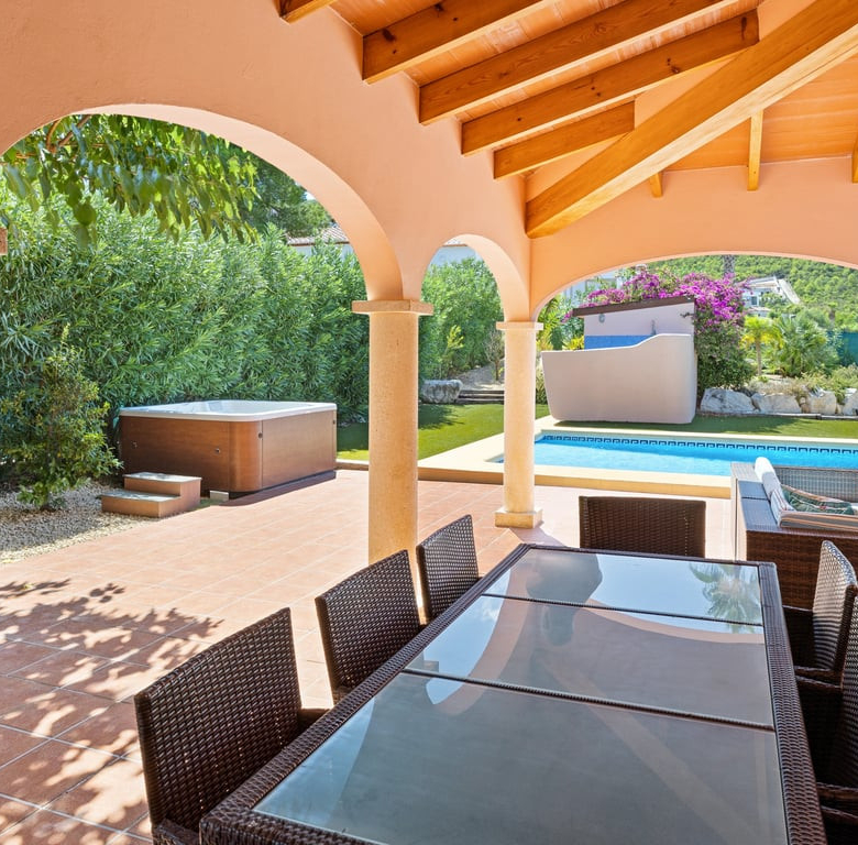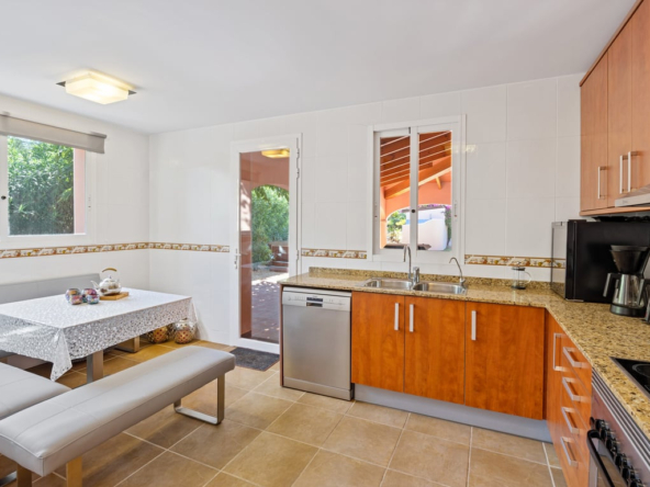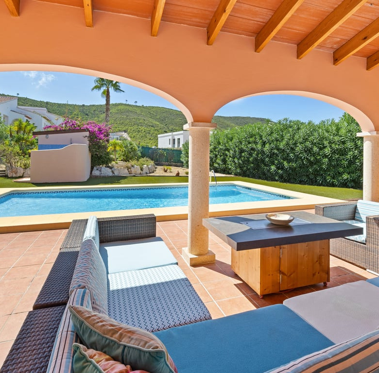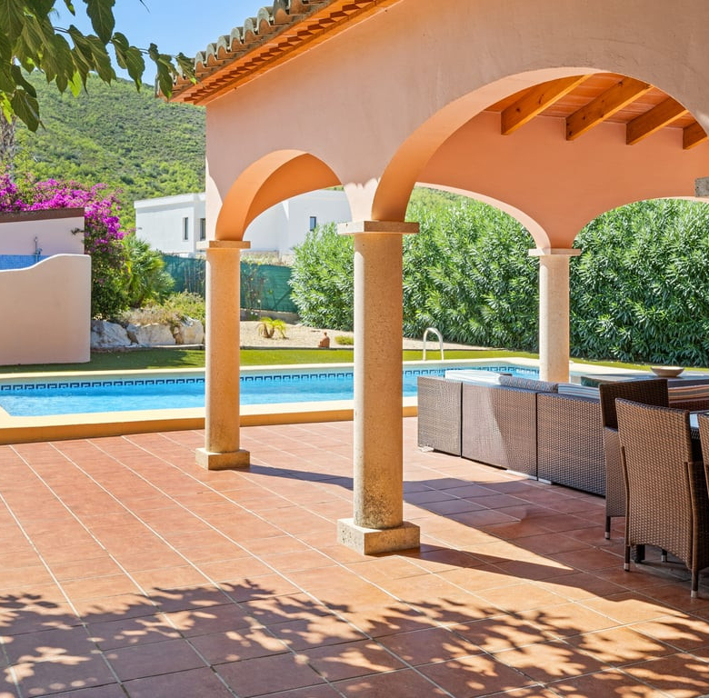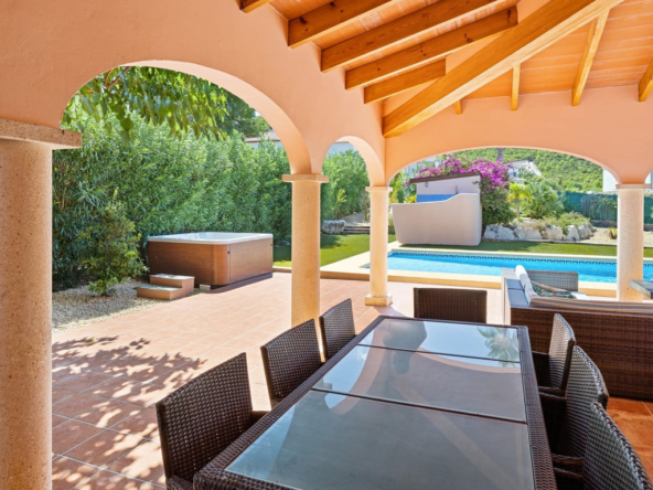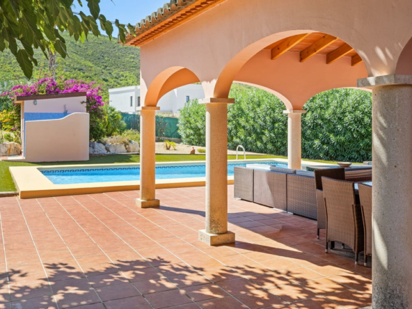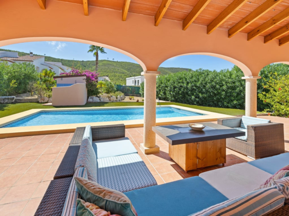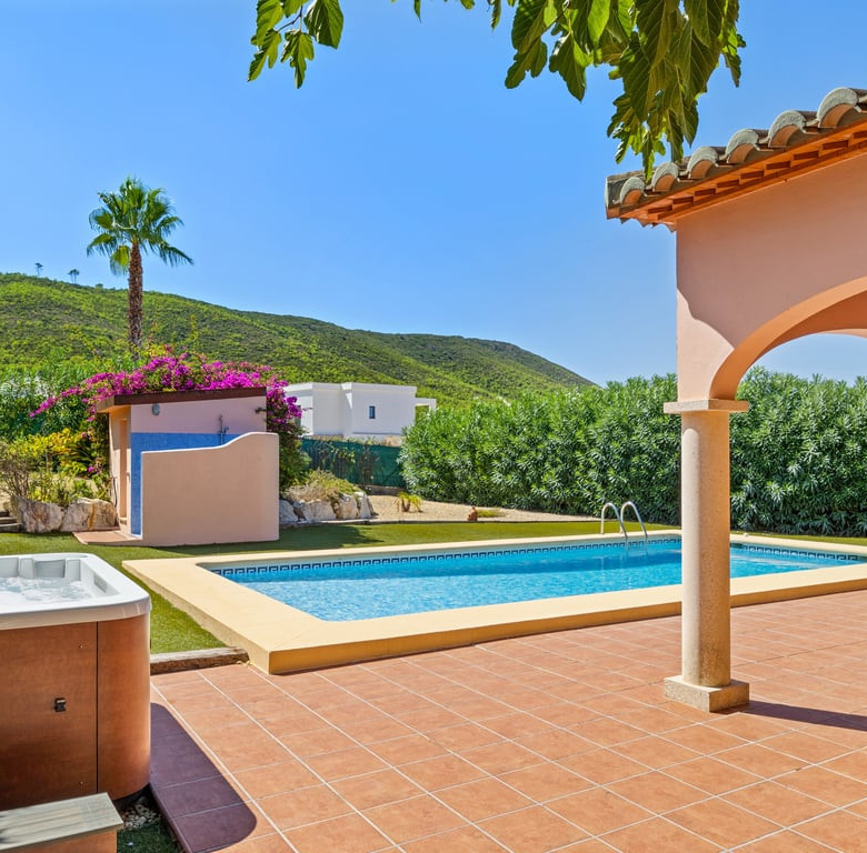 Das Herzstück ist die große Naya mit Blick auf den Mosaikpool und die Berge. Das eingezäunte Grundstück bietet Garage, Stellplätze, Solarpaneele, pflegeleichten Garten mit Kunstrasen, Bepflanzung, Whirlpool/Spa und praktisches Außentoilette.