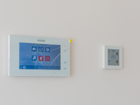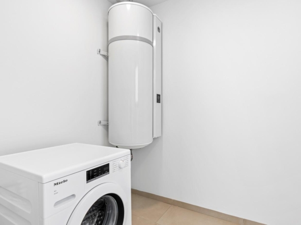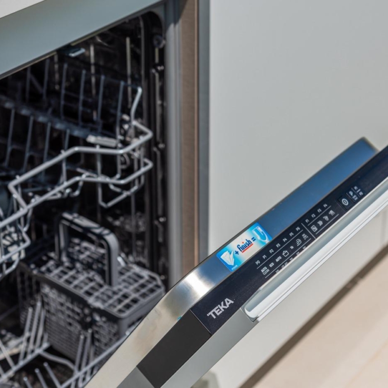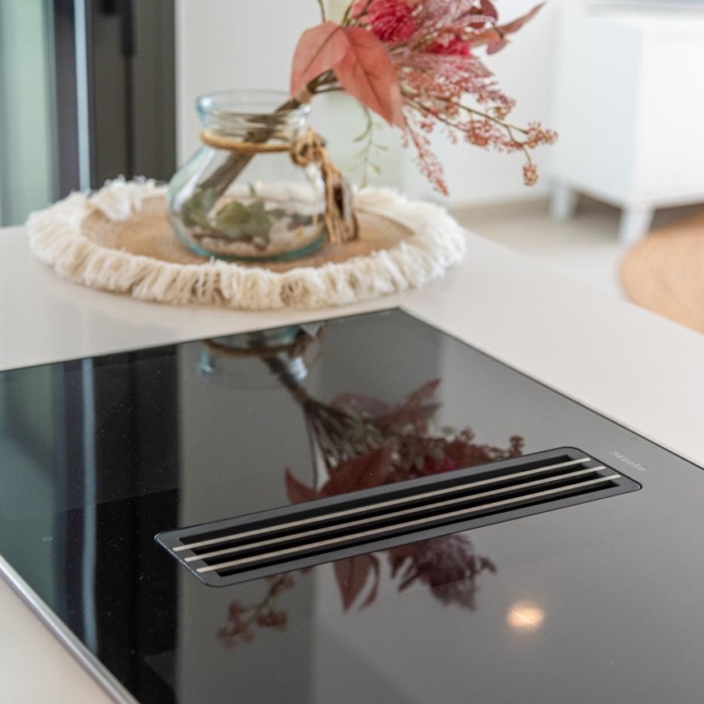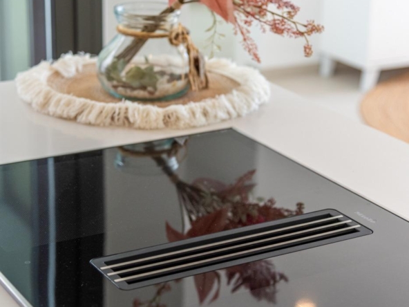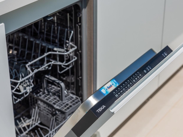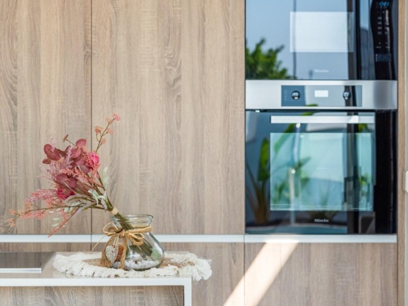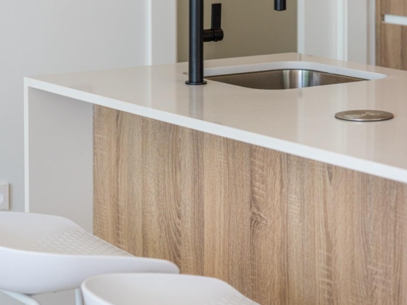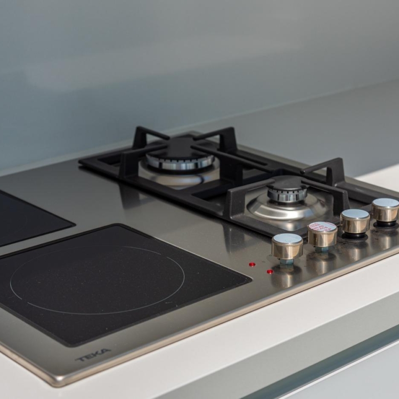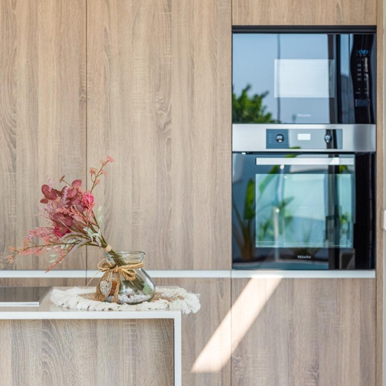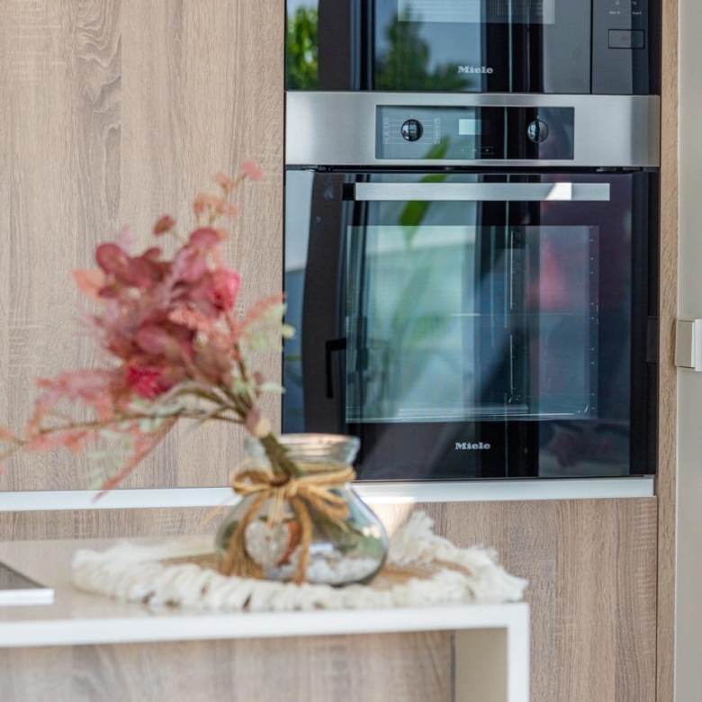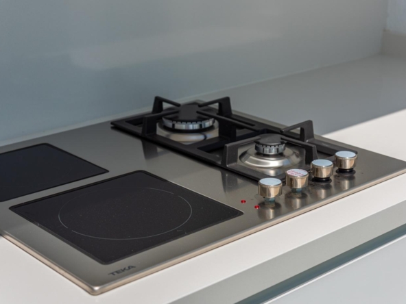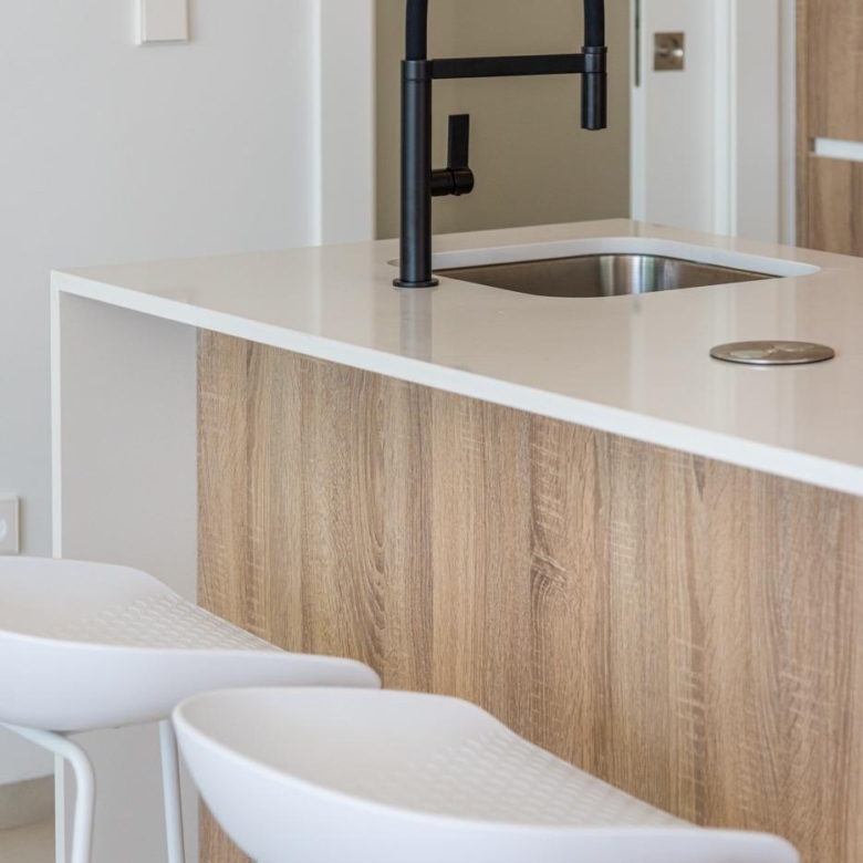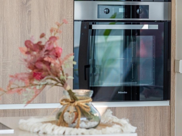 Voll ausgestattete Küche in weißem Glanz oder Holzfarbe. Technologischer Quarz. Spüle aus rostfreiem Stahl. Induktionskochfeld mit integriertem Dunstabzug, Backofen, Mikrowelle, Waschmaschine, integrierter Kühlschrank, integrierter Geschirrspüler.