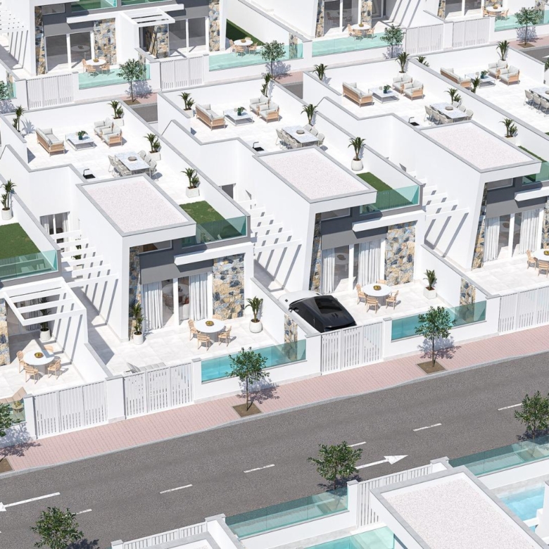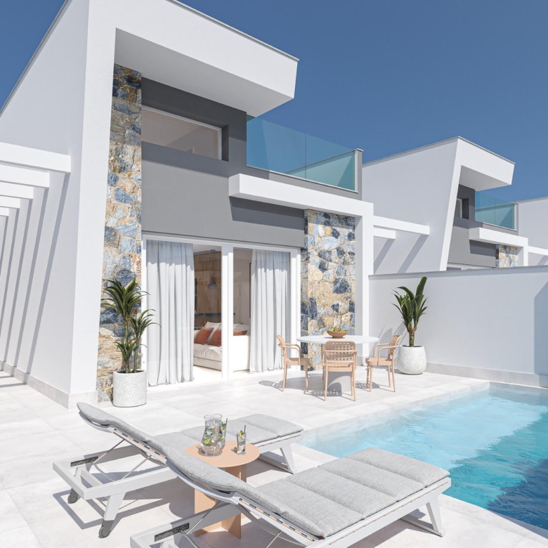 Entdecken Sie diese exklusive Wohnanlage mit fünf einstöckigen Villen in der charmanten Stadt Los Alcázares. Jede Villa verfügt über einen privaten Swimmingpool mit Wasserfall, eine geräumige Sonnenterrasse mit ganzjährigem Sonnenschein und eine moderne, komfortable und stilvolle Innenausstattung.