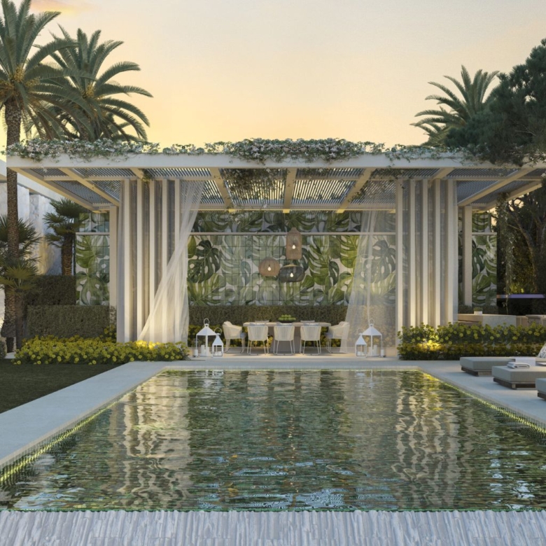 Der Außenbereich der Villa ist eine wahre Oase der Ruhe und des Luxus. Er verfügt über einen privaten Pool, ideal, um die sonnigen Tage in Marbella zu genießen. Die Terrasse bietet einen idealen Raum zum Entspannen oder um Gäste zu empfangen, mit Panoramablicken, die die Schönheit der natürlichen Umgebung einfangen. Das Design des Gartens ergänzt die Architektur der Villa und schafft eine harmonische und einladende Atmosphäre. Darüber hinaus ermöglicht die Nähe zum Meer, nur 5 km entfernt, Küstenspaziergänge und Wassersportaktivitäten.