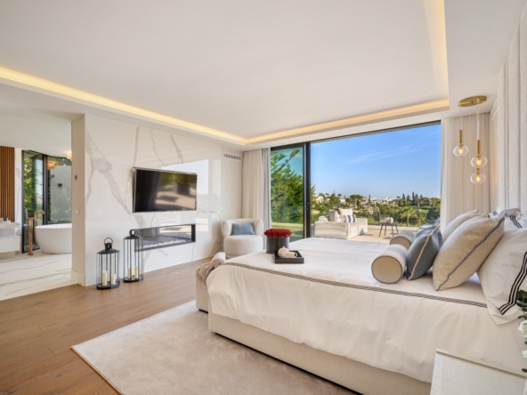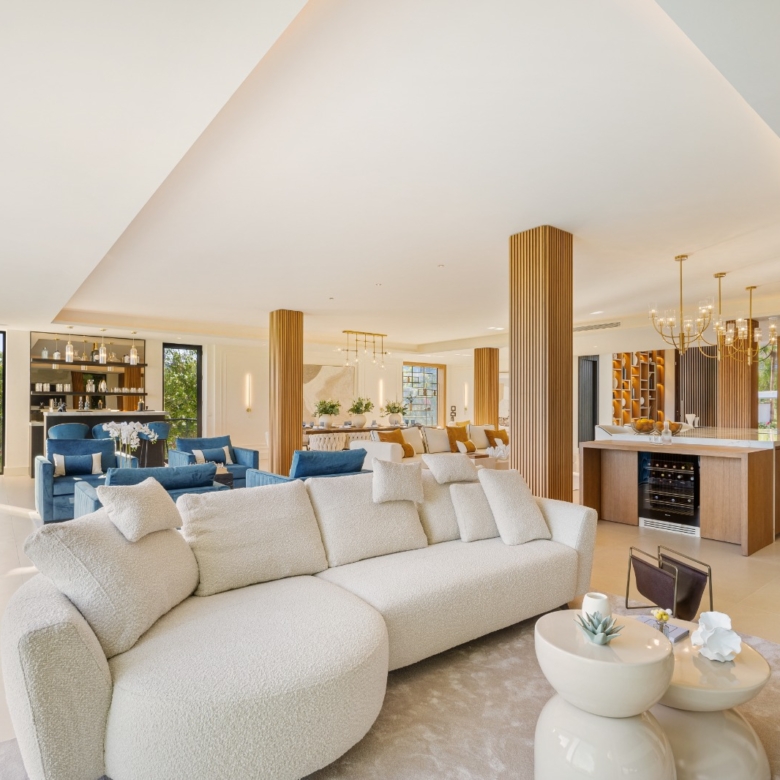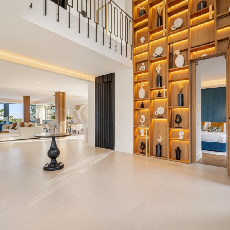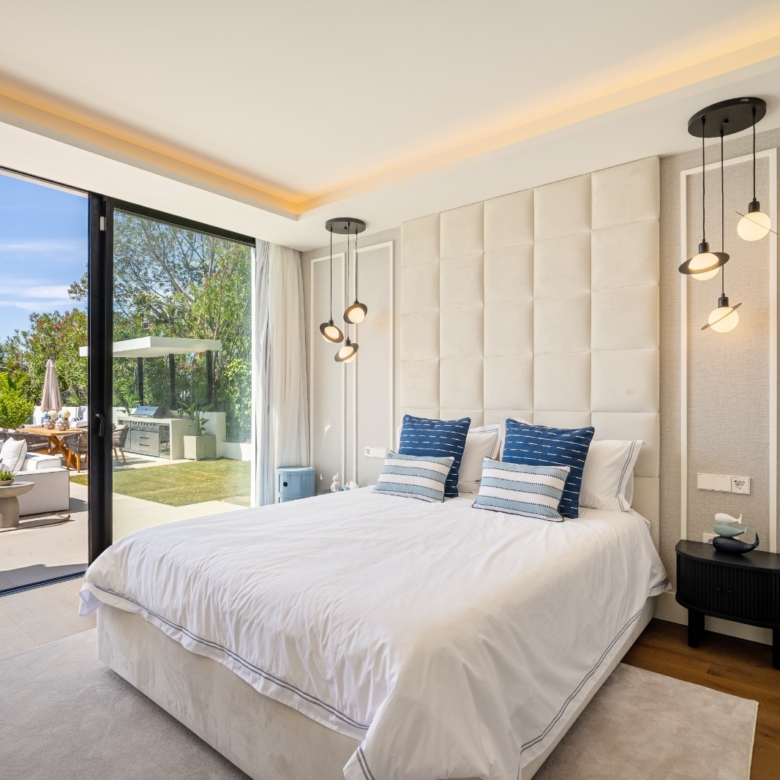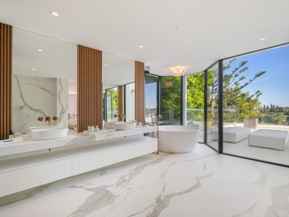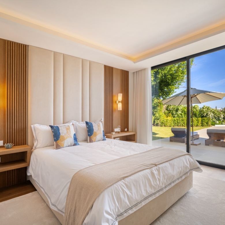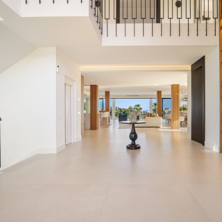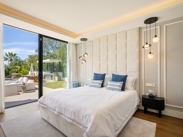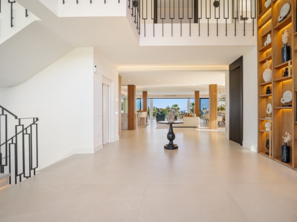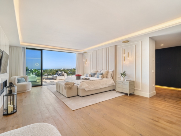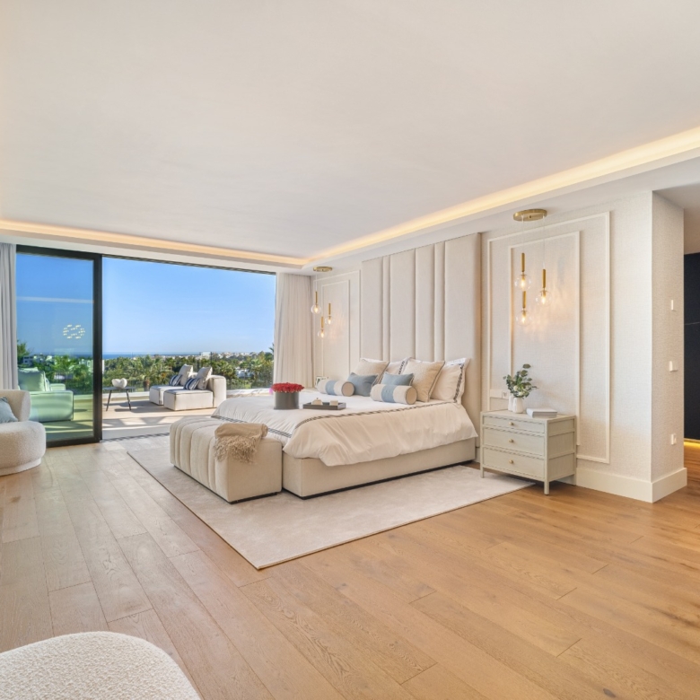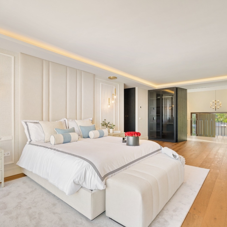Im Inneren bietet die Villa ein geräumiges und funktionales Design mit sechs Schlafzimmern und sechs Bädern, das viel Platz für große Familien oder Gäste bietet. Die Einbauschränke in den Zimmern sorgen für effiziente und ordentliche Aufbewahrung. Die Aufteilung umfasst eine Garage, die den Bewohnern Komfort und Sicherheit für ihre Fahrzeuge bietet.