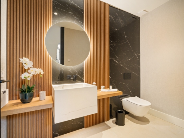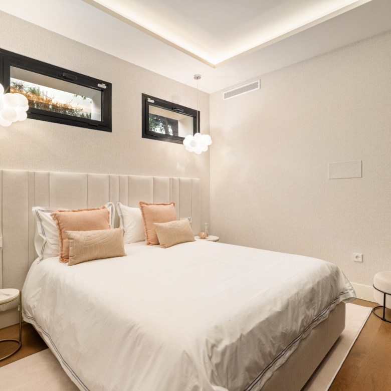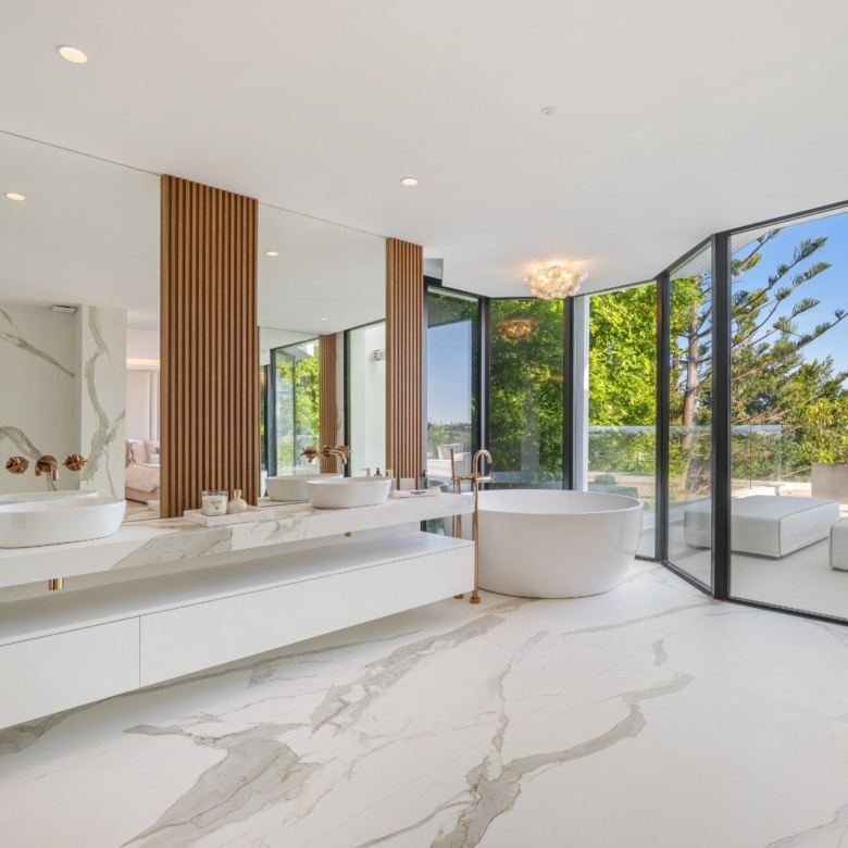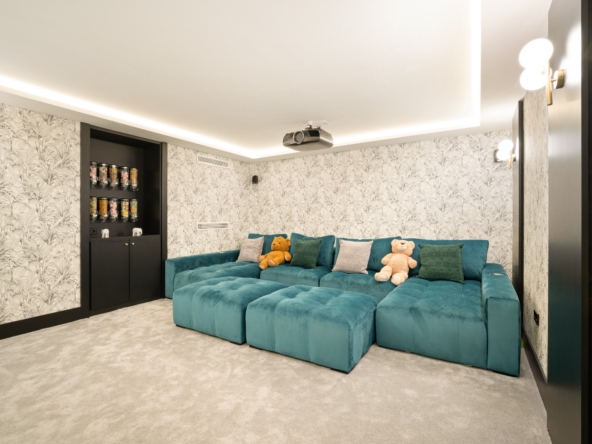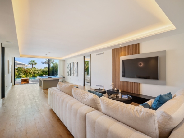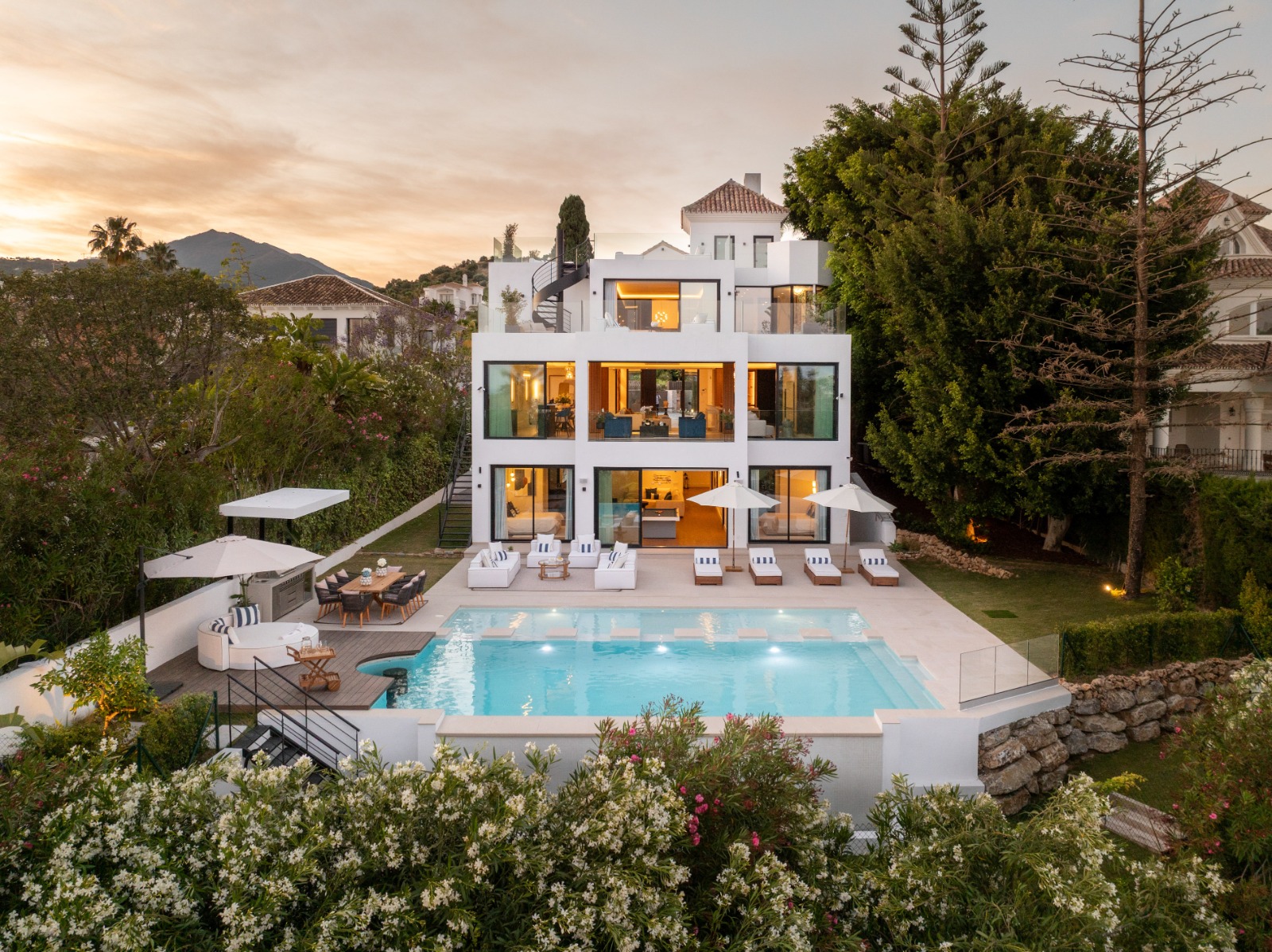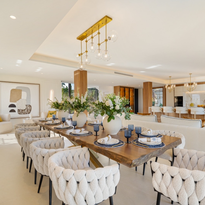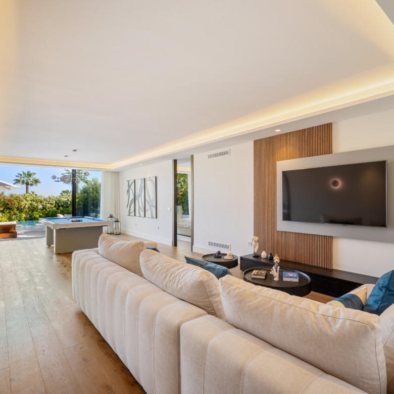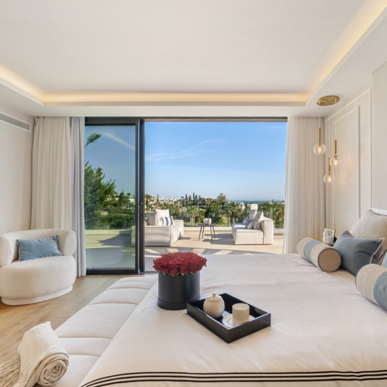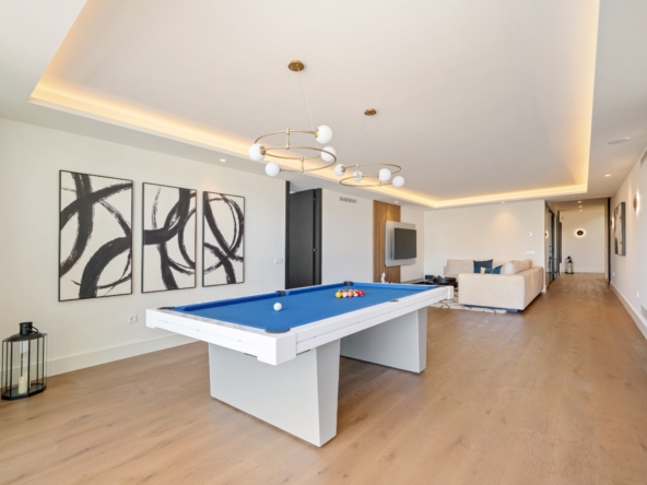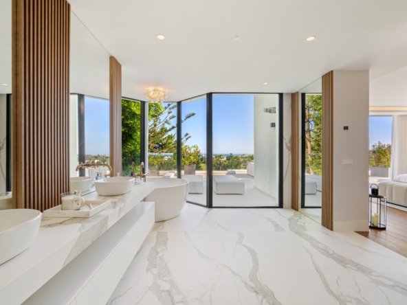 Im Inneren bietet die Villa ein geräumiges und funktionales Design mit sechs Schlafzimmern und sechs Bädern, das viel Platz für große Familien oder Gäste bietet. Die Einbauschränke in den Zimmern sorgen für effiziente und ordentliche Aufbewahrung. Die Aufteilung umfasst eine Garage, die den Bewohnern Komfort und Sicherheit für ihre Fahrzeuge bietet.