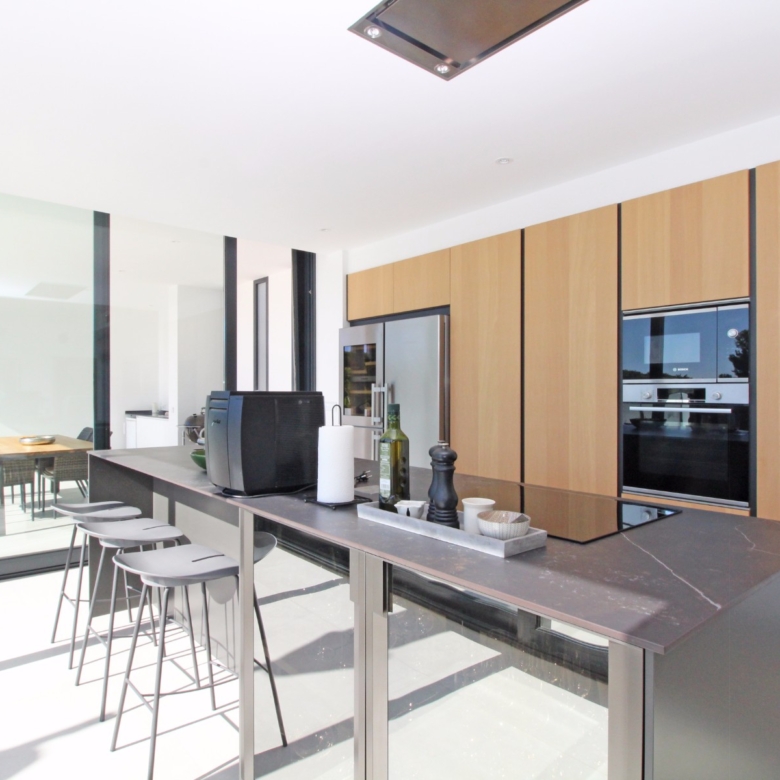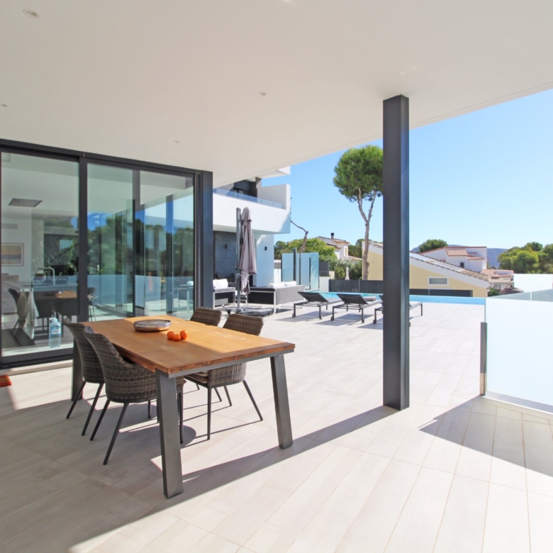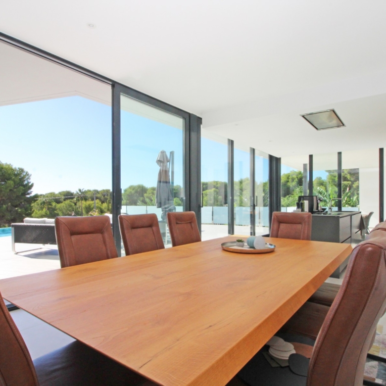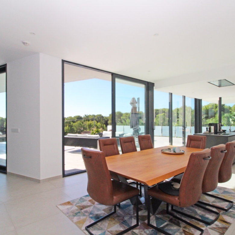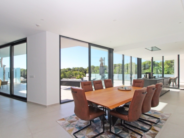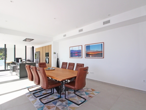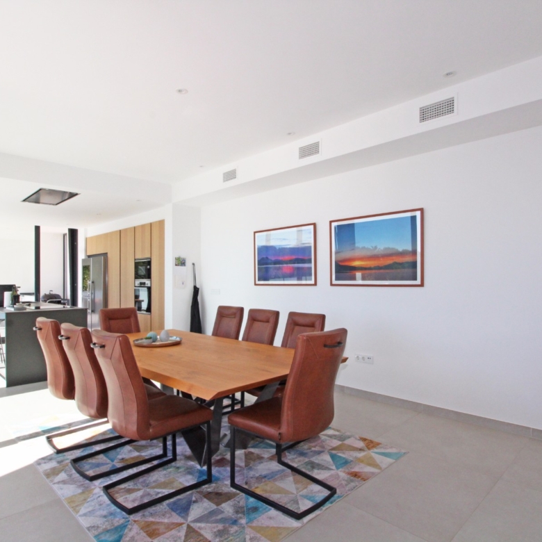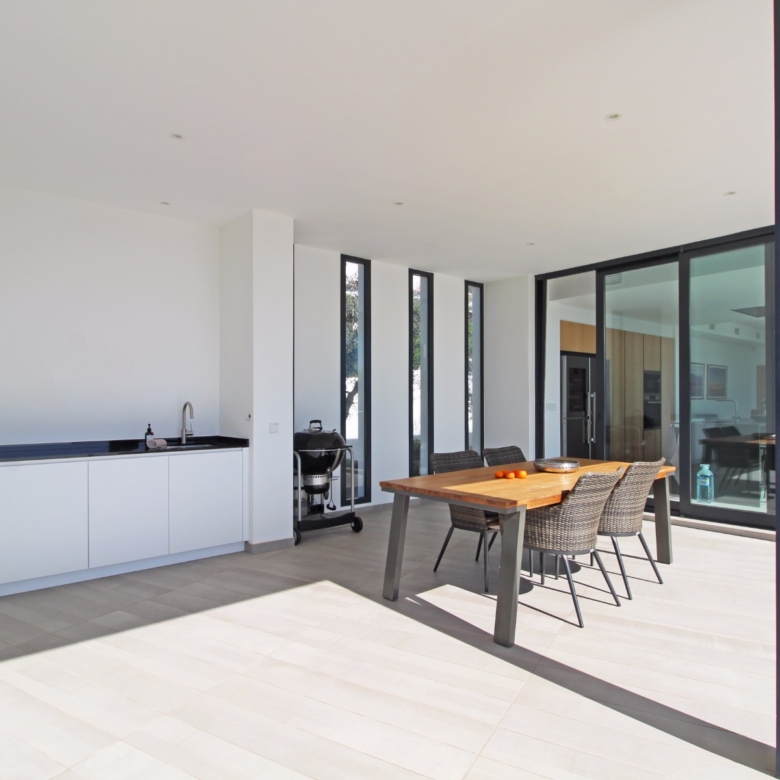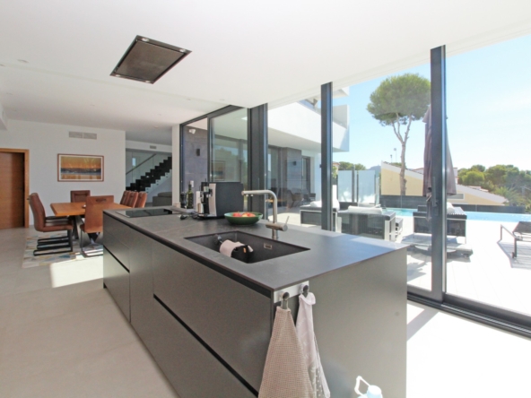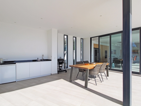 Beim Betreten werden Sie von einer geräumigen Eingangshalle empfangen, die in ein großes, offenes Wohn- und Esszimmer führt, das für eine helle und luftige Atmosphäre gestaltet ist. Die stilvolle, moderne Küche ist mit einer zentralen Kochinsel und allen Annehmlichkeiten ausgestattet, die sich ein Kochliebhaber nur wünschen kann. Große Glasschiebetüren bieten Zugang zu einer überdachten Sommerküche, ideal für das Essen und Kochen im Freien. Von der Küche und dem Wohnzimmer aus gelangen Sie direkt auf die großzügige Sonnenterrasse, wo Sie ein beheizter Pool und ein geräumiger Poolbereich mit Außendusche erwarten. Dies ist der perfekte Ort, um sich zu entspannen und den mediterranen Lebensstil zu genießen oder um Freunde und Familie zu einem Treffen am Pool einzuladen.