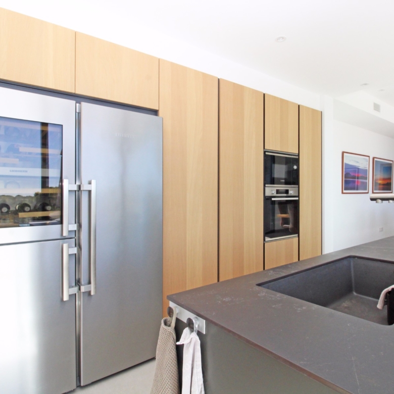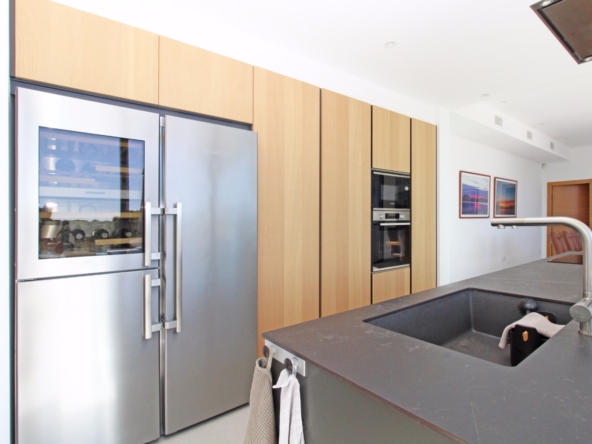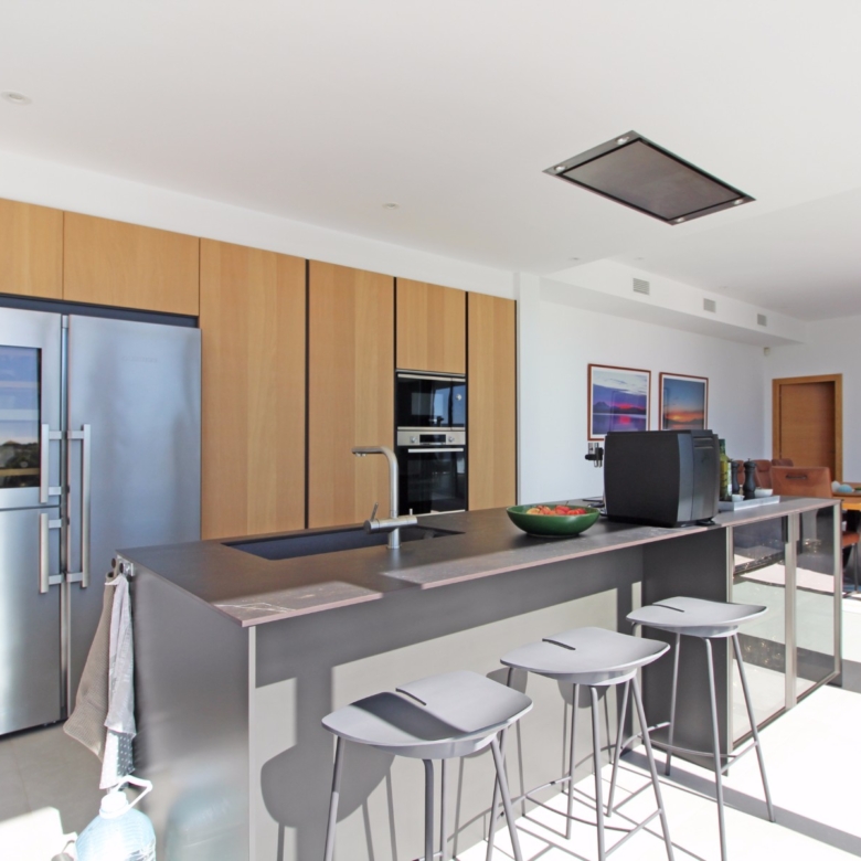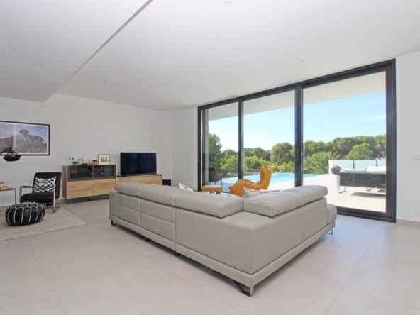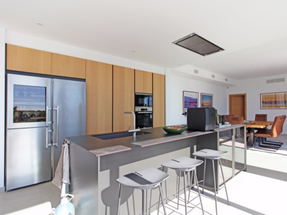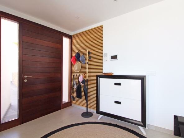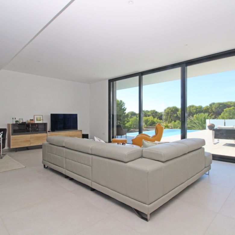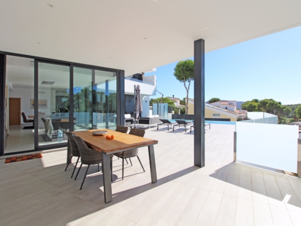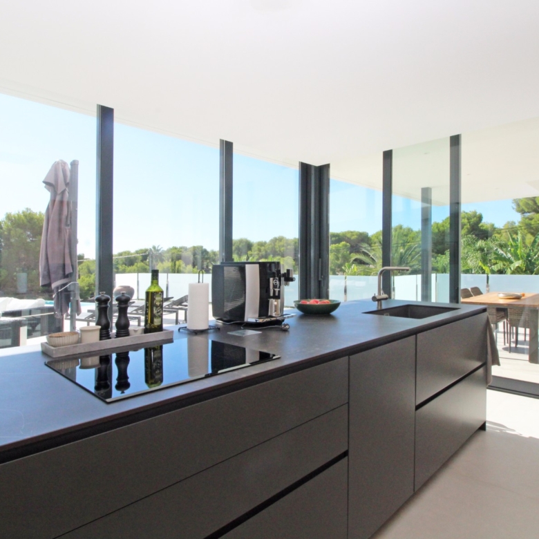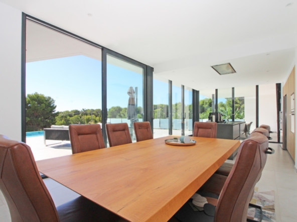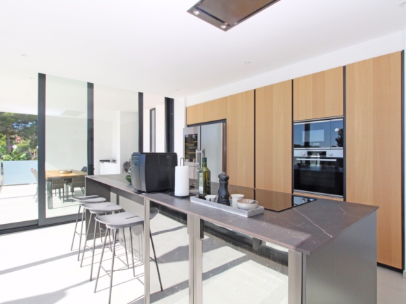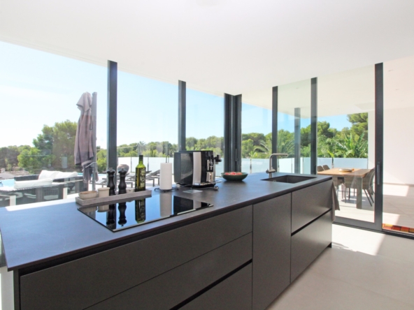 Beim Betreten werden Sie von einer geräumigen Eingangshalle empfangen, die in ein großes, offenes Wohn- und Esszimmer führt, das für eine helle und luftige Atmosphäre gestaltet ist. Die stilvolle, moderne Küche ist mit einer zentralen Kochinsel und allen Annehmlichkeiten ausgestattet, die sich ein Kochliebhaber nur wünschen kann. Große Glasschiebetüren bieten Zugang zu einer überdachten Sommerküche, ideal für das Essen und Kochen im Freien. Von der Küche und dem Wohnzimmer aus gelangen Sie direkt auf die großzügige Sonnenterrasse, wo Sie ein beheizter Pool und ein geräumiger Poolbereich mit Außendusche erwarten. Dies ist der perfekte Ort, um sich zu entspannen und den mediterranen Lebensstil zu genießen oder um Freunde und Familie zu einem Treffen am Pool einzuladen.