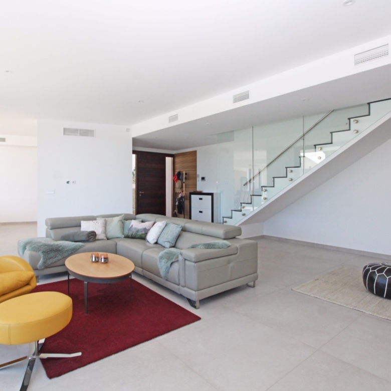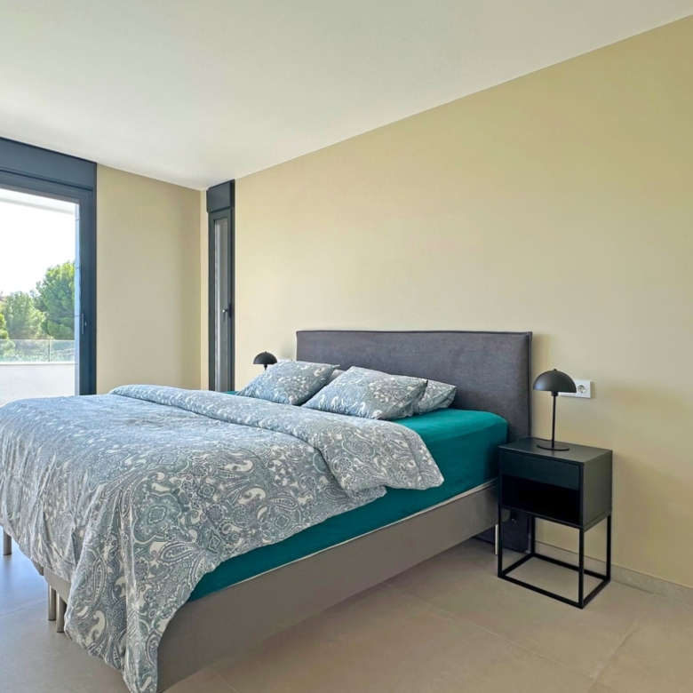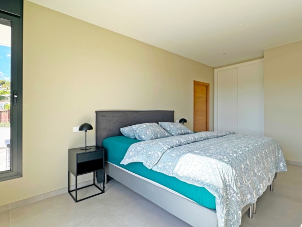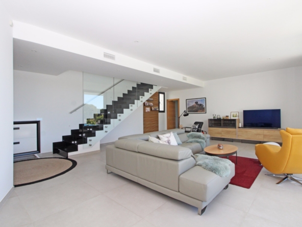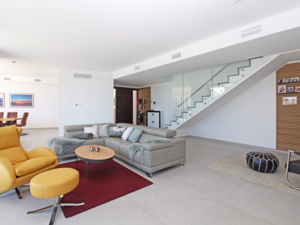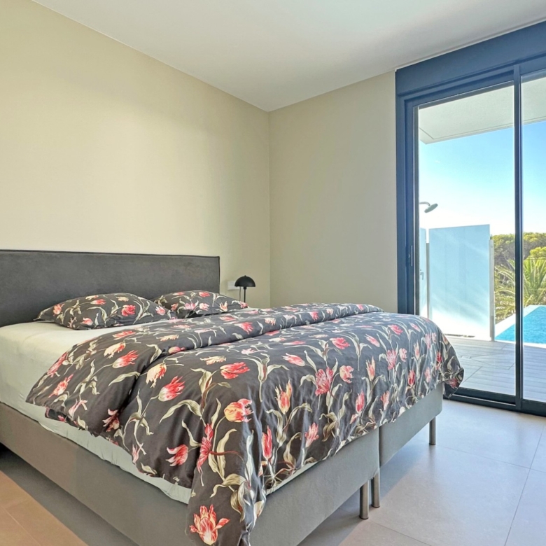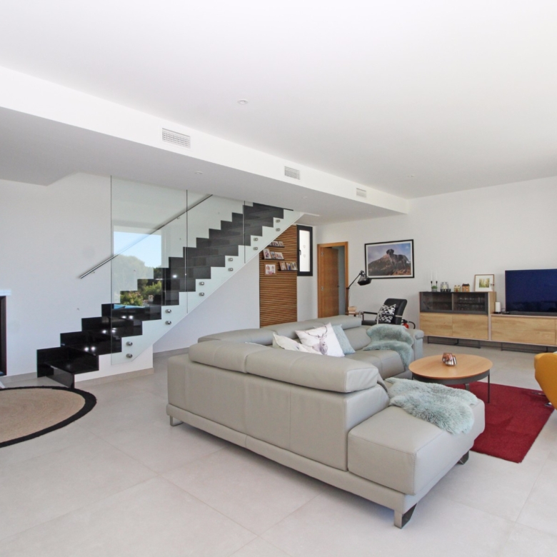 Eine elegante, offene Treppe führt Sie in das Obergeschoss, wo Sie zwei weitere Schlafzimmer finden, die sich ein modernes Bad teilen, sowie ein drittes Schlafzimmer mit eigenem Bad. Alle Schlafzimmer haben direkten Zugang zu einer großen Terrasse, ideal, um das Panorama zu genießen. Jedes Schlafzimmer ist mit automatischen Rollläden ausgestattet, die zusätzlichen Komfort und Privatsphäre bieten.