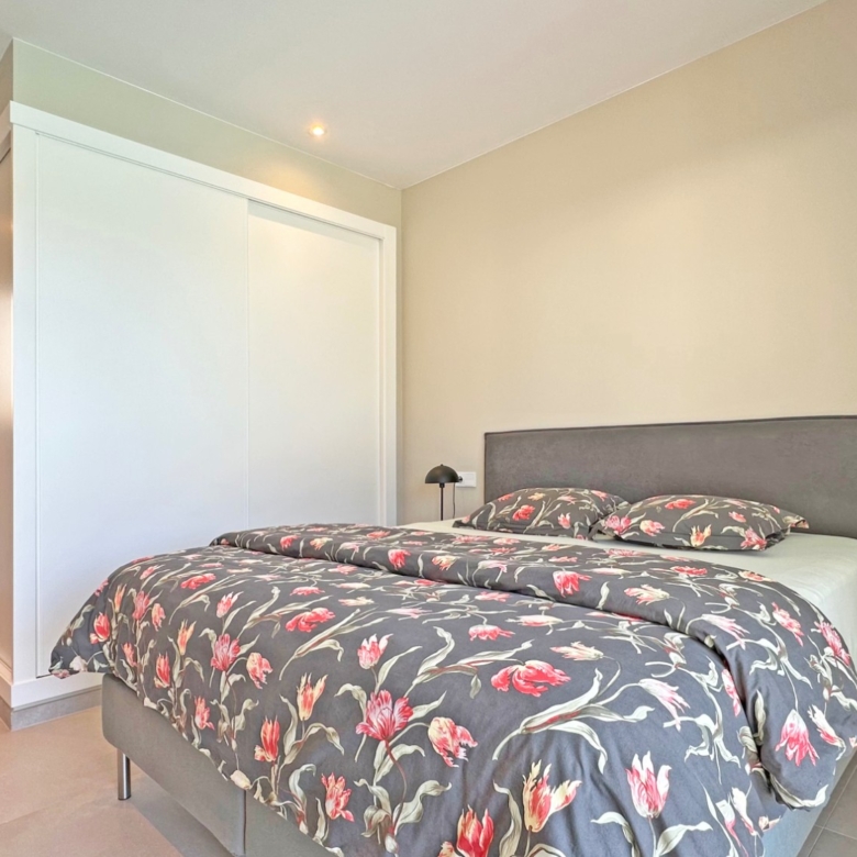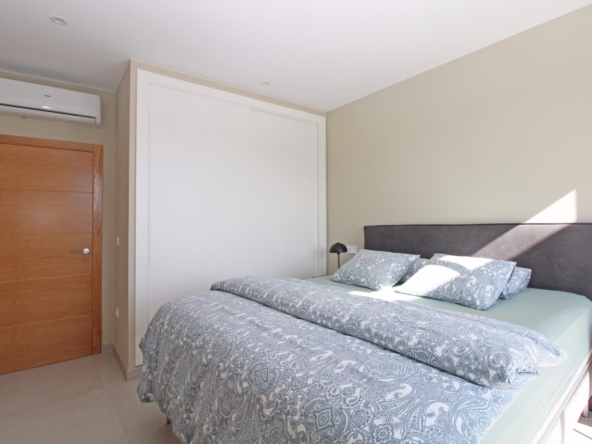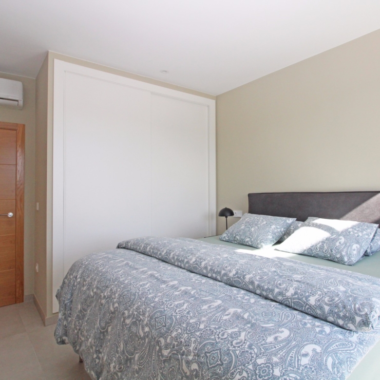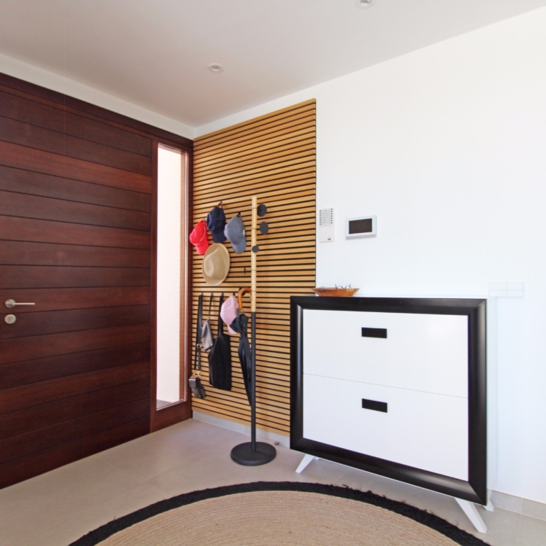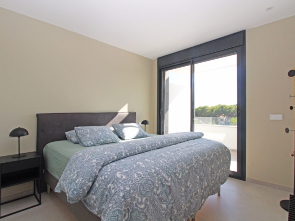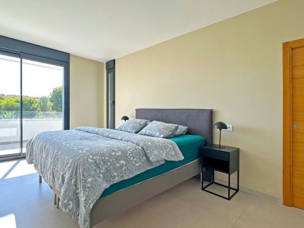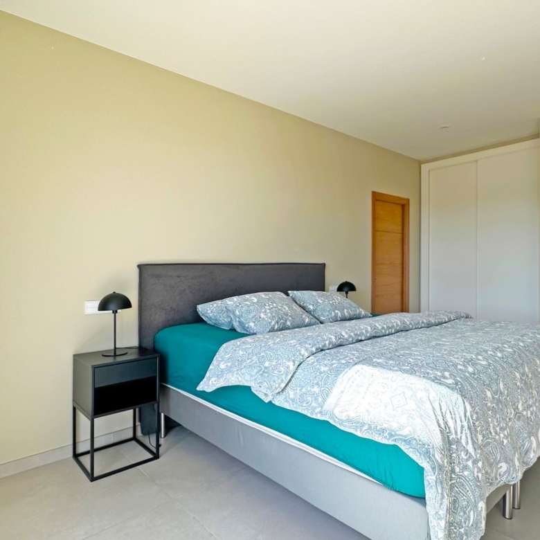 Eine elegante, offene Treppe führt Sie in das Obergeschoss, wo Sie zwei weitere Schlafzimmer finden, die sich ein modernes Bad teilen, sowie ein drittes Schlafzimmer mit eigenem Bad. Alle Schlafzimmer haben direkten Zugang zu einer großen Terrasse, ideal, um das Panorama zu genießen. Jedes Schlafzimmer ist mit automatischen Rollläden ausgestattet, die zusätzlichen Komfort und Privatsphäre bieten.