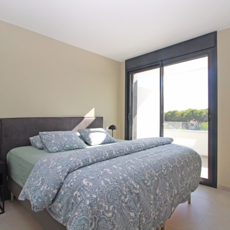 Im Erdgeschoss befindet sich außerdem ein Gäste-WC sowie das luxuriöse Hauptschlafzimmer mit eigenem Bad und begehbarer Dusche. Das Hauptschlafzimmer strahlt Komfort und Eleganz aus und bietet direkten Zugang zur Außenterrasse.