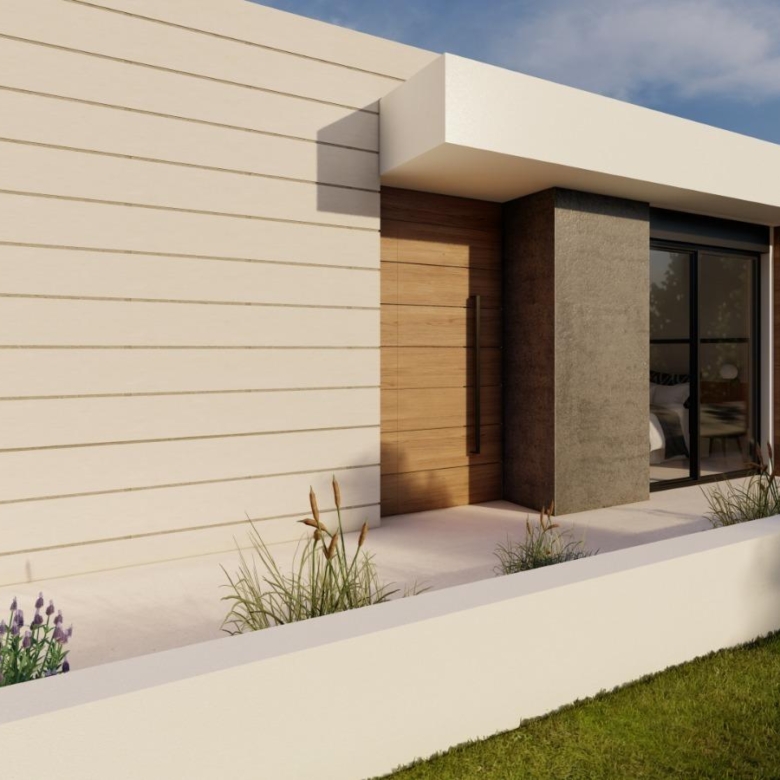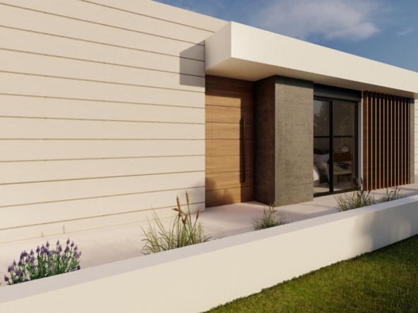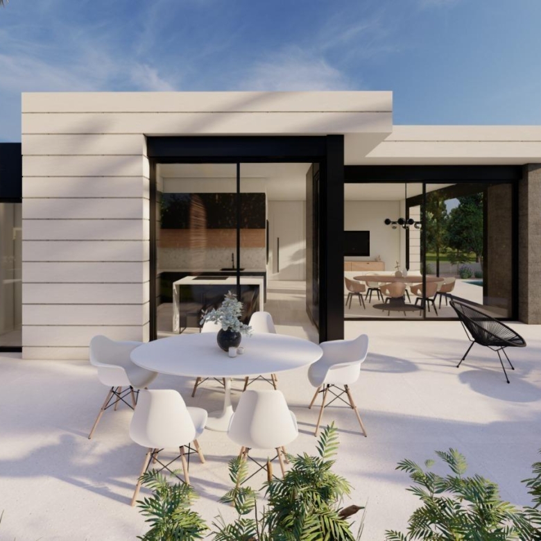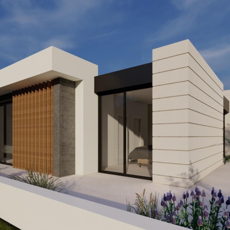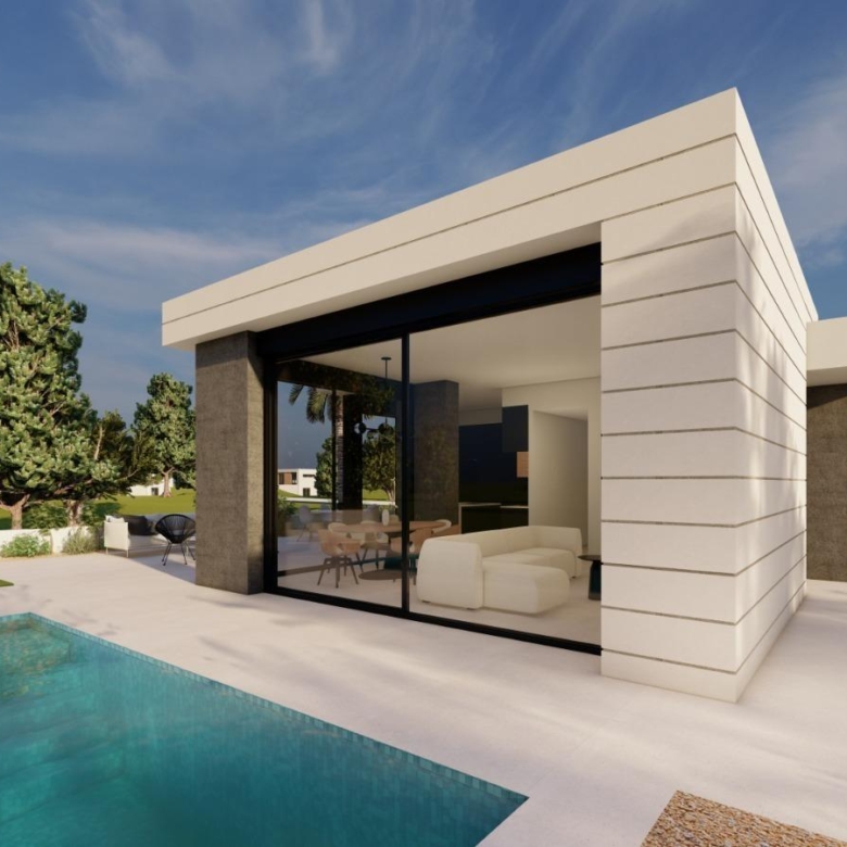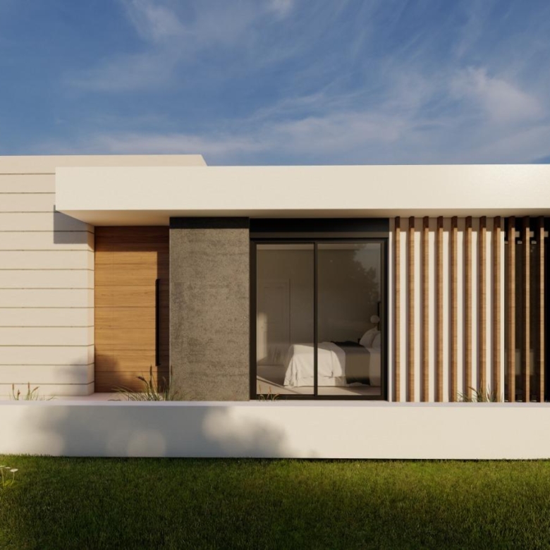 Neubau einer Ebene Villen verfügt über 3 Schlafzimmer, 2 Bäder, Gäste-WC, offene Küche mit dem Wohnbereich, Einbauschränke, privater Garten mit privatem Pool und abseits der Straße Parkplatz.