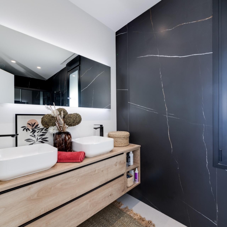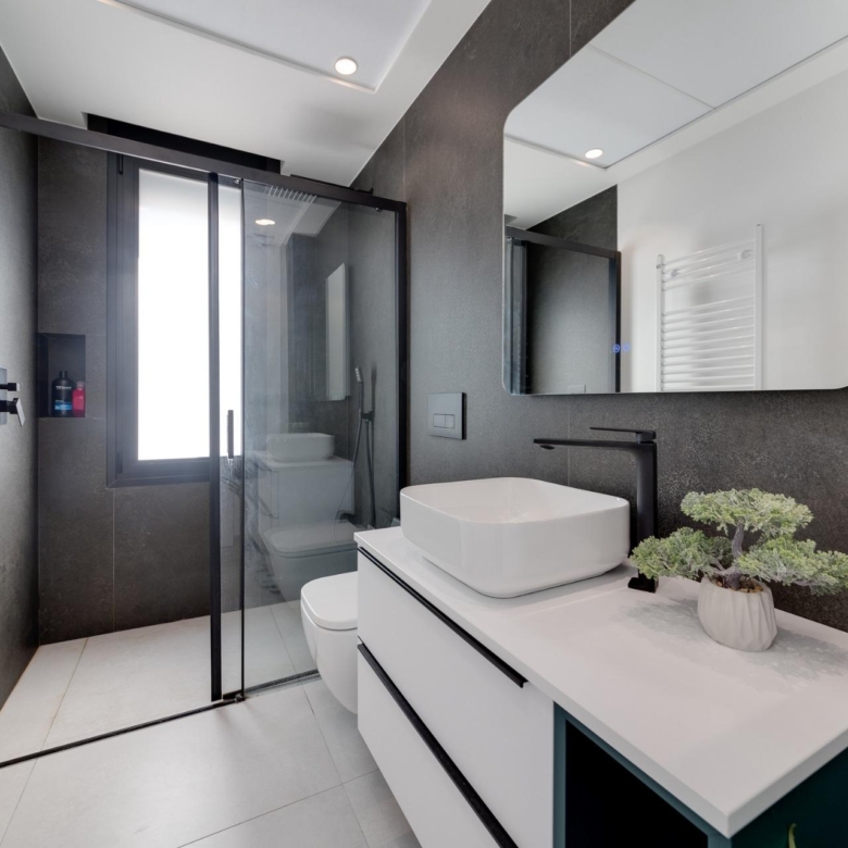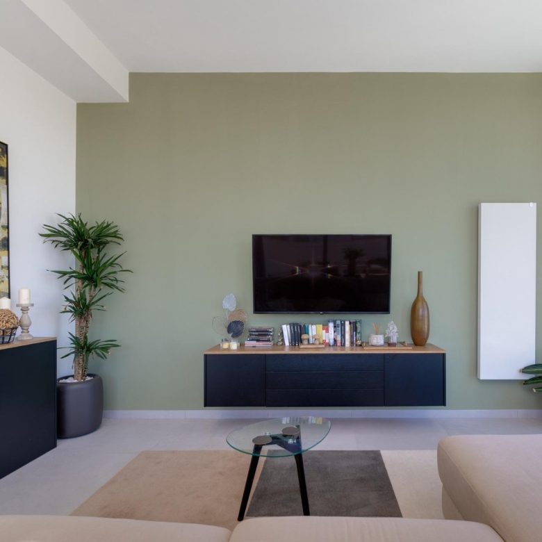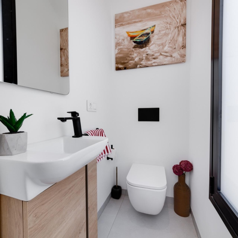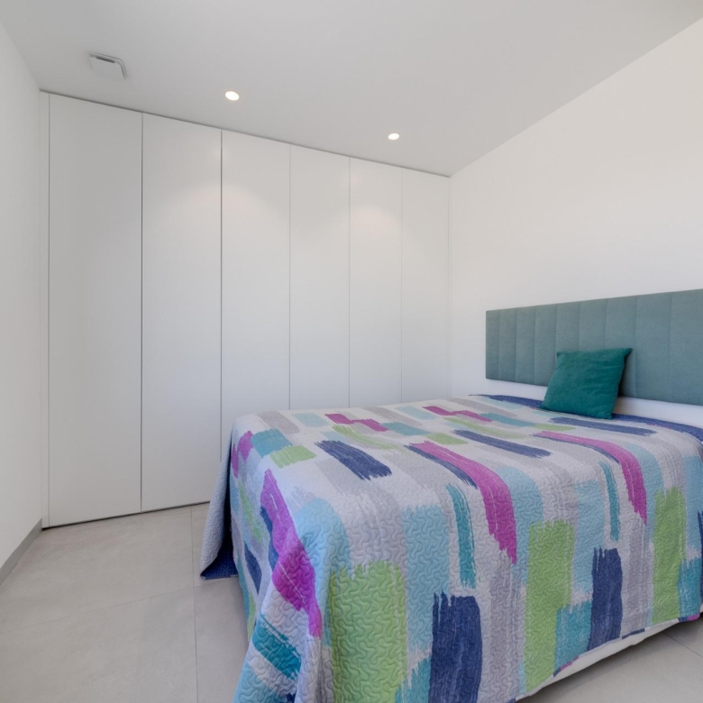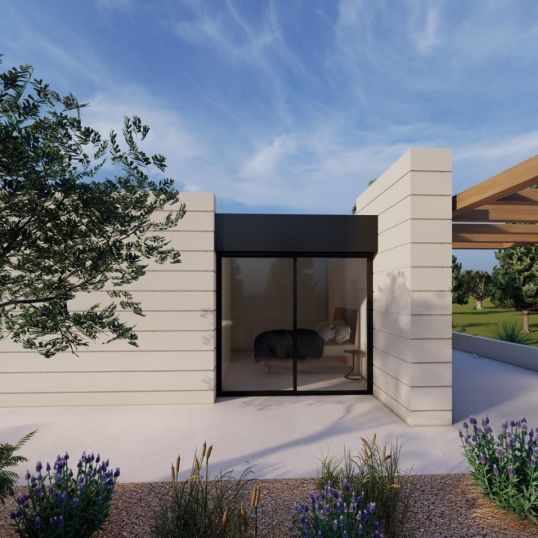 Neubau einer Ebene Villen verfügt über 3 Schlafzimmer, 2 Bäder, Gäste-WC, offene Küche mit dem Wohnbereich, Einbauschränke, privater Garten mit privatem Pool und abseits der Straße Parkplatz.