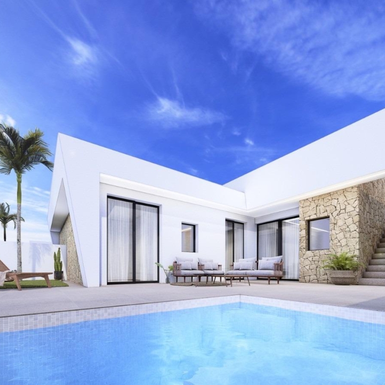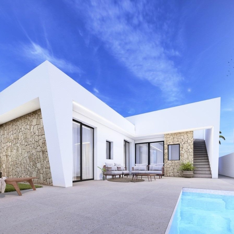 Neubau von Villen mit 3 Schlafzimmern, Parkplätzen auf der Vorderseite, Steinmauern, privatem Swimmingpool auf der Rückseite, großer Dachterrasse und einem Abstellraum in Roldan, Torre-Pacheco.