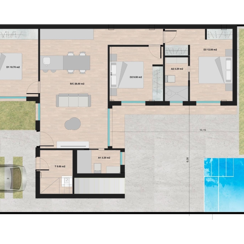 3 Schlafzimmer (Hauptschlafzimmer en-suite) und ein separates Familienbadezimmer… entworfen im zeitgenössischen „Öko“-Stil und mit einem offenen Konzept, bestehend aus einer Einbauküche und einem Wohn-Esszimmer, einem Abstellraum auf der Vorderseite und einem privaten Sommerterrassenbereich.