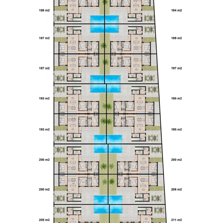Es handelt sich um ein ausgewähltes Projekt mit nur 20 modernen einstöckigen Villen, die alle über großzügige Grundstücke mit privatem Swimmingpool und Dachterrasse verfügen.