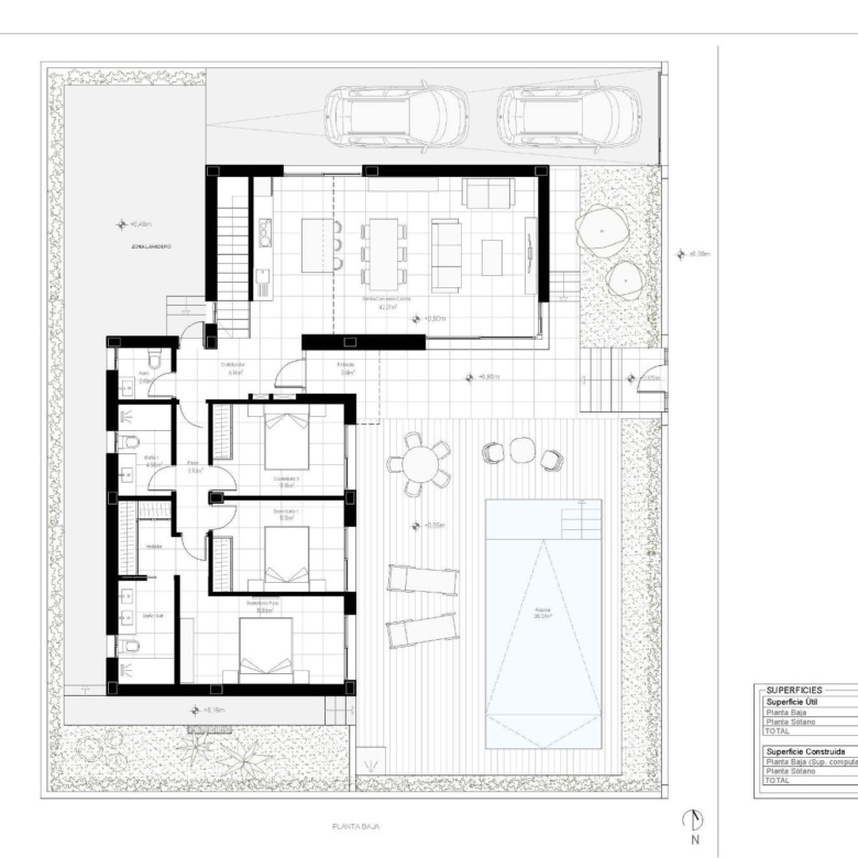 Jede Villa verfügt über ein modernes, offenes Design mit 3 Schlafzimmern, 2 Bädern und einer Gästetoilette. Der helle und geräumige Wohnbereich integriert eine voll ausgestattete Küche mit Ess- und Wohnbereich und führt hinaus in einen privaten Garten mit Swimmingpool. Ein privater Parkplatz abseits der Straße ist ebenfalls vorhanden. Auf der unteren Ebene bietet ein fertiggestellter Keller von 136 m² mit glatten Wänden, Wasser- und Stromanschlüssen einen vielseitigen Raum für zusätzliche Schlafzimmer, ein Büro, einen Fitnessraum, einen Kinoraum oder einen Kinderspielbereich.