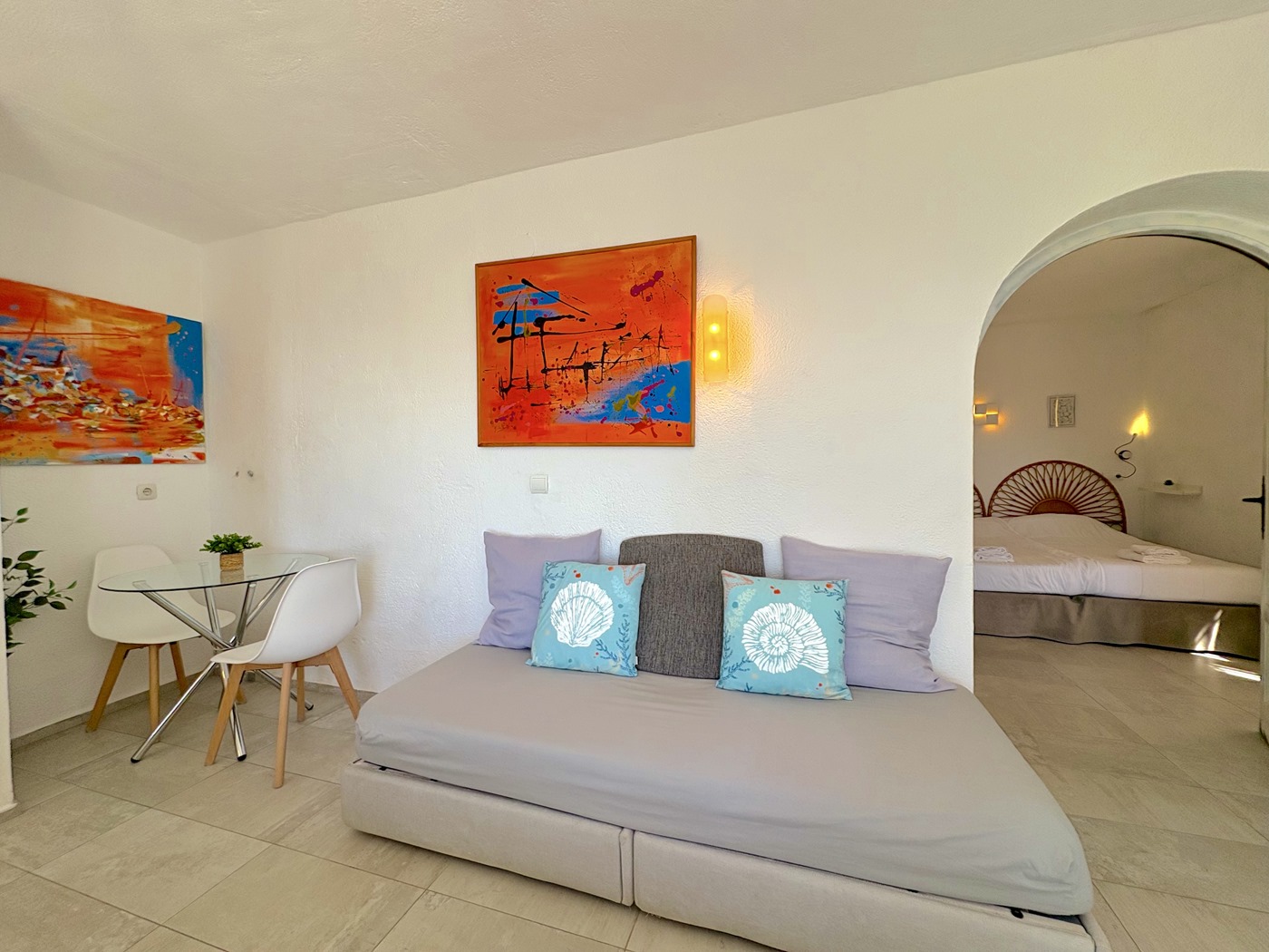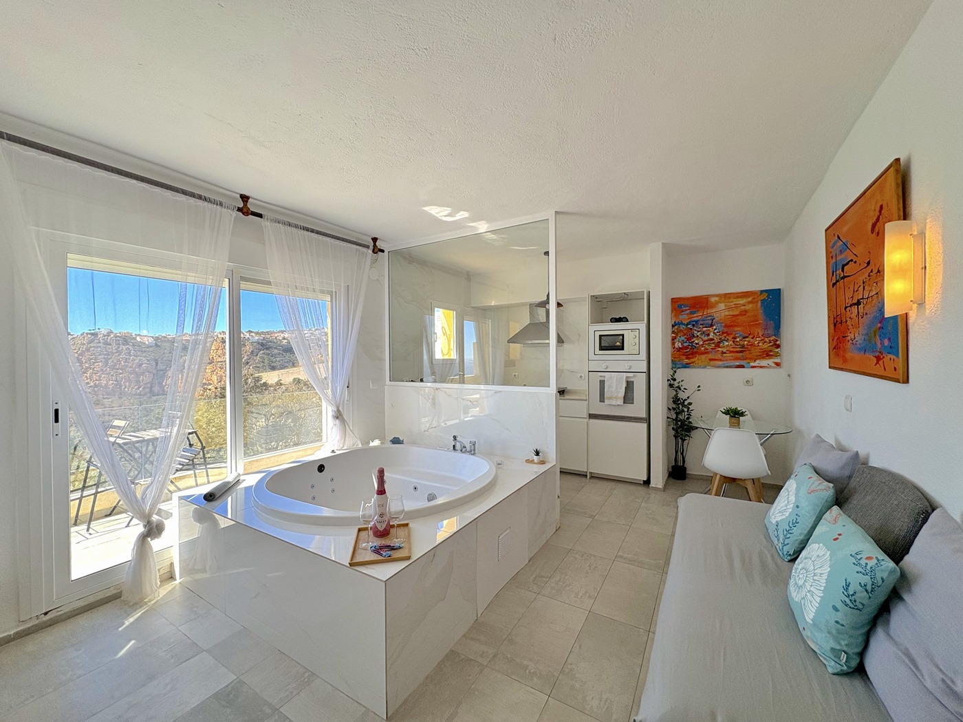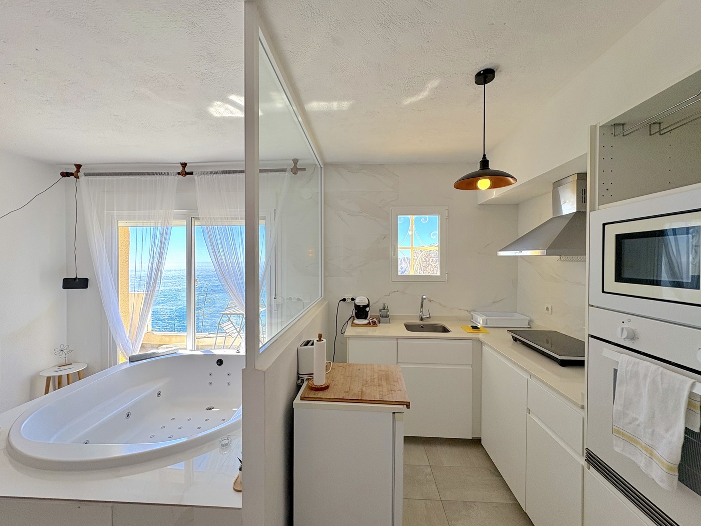 1 helles Schlafzimmer mit gemütlicher Dekoration und einem großen Fenster, das viel Tageslicht hereinlässt.Wohn-Esszimmer-Küche im mediterranen Stil, dekoriert mit lebendigen Farben, die Wärme und Frische ausstrahlen.Terrasse mit Panoramablick auf das Meer und mit Markise, perfekt zum Entspannen oder Teilen unvergesslicher Momente.Funktionale und ausgestattete Küche, die in den Wohnbereich integriert ist.Vollbad, bequem und gut aufgeteilt.Bevorzugte Lage: