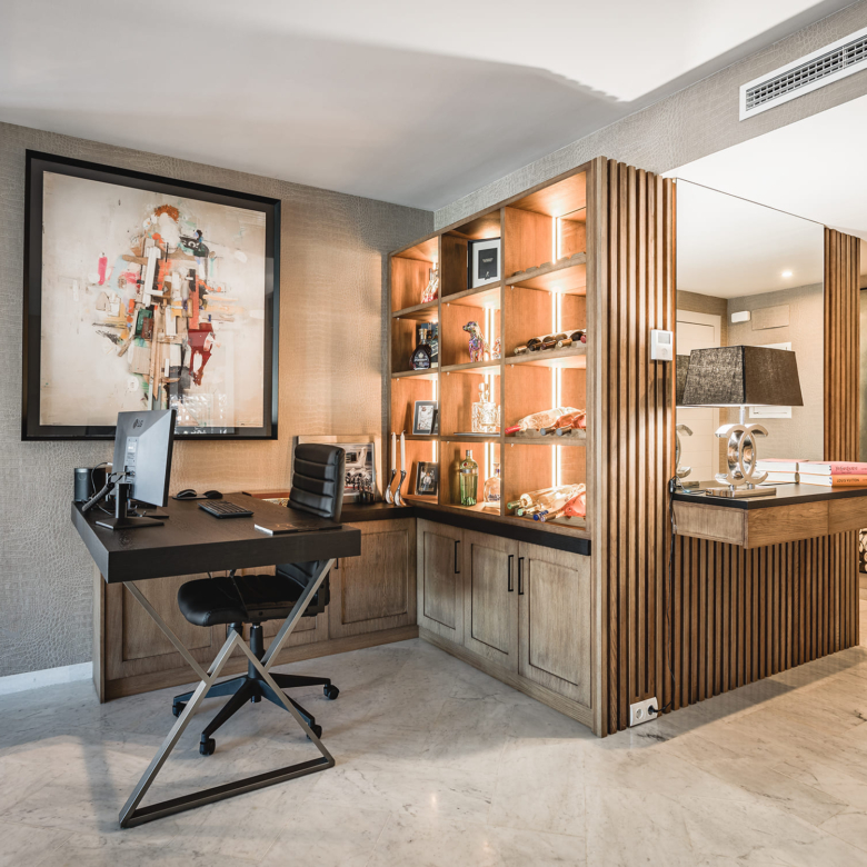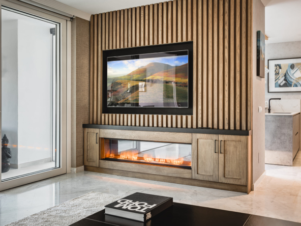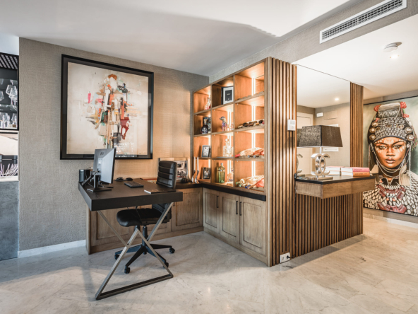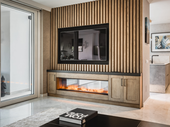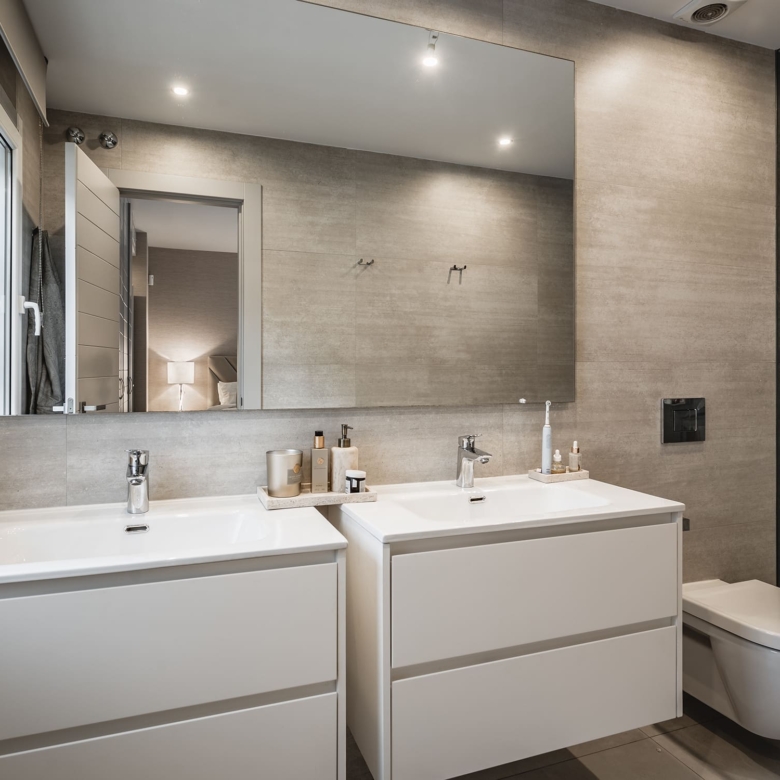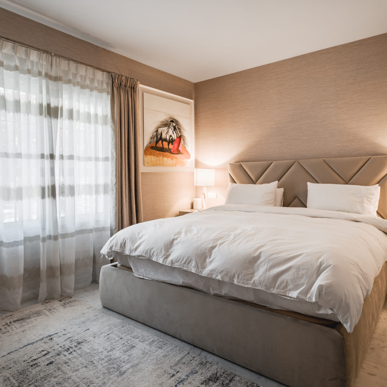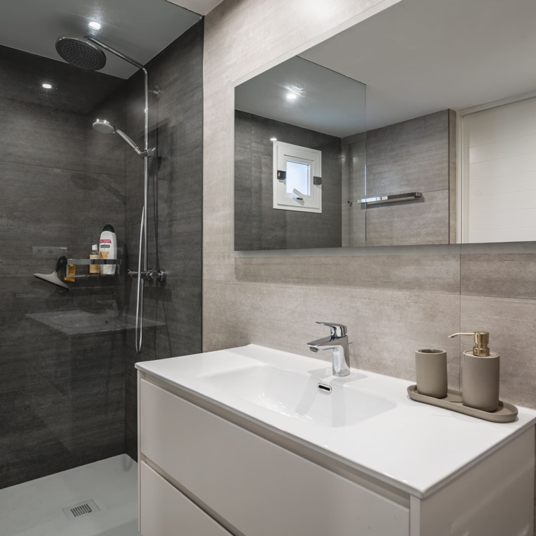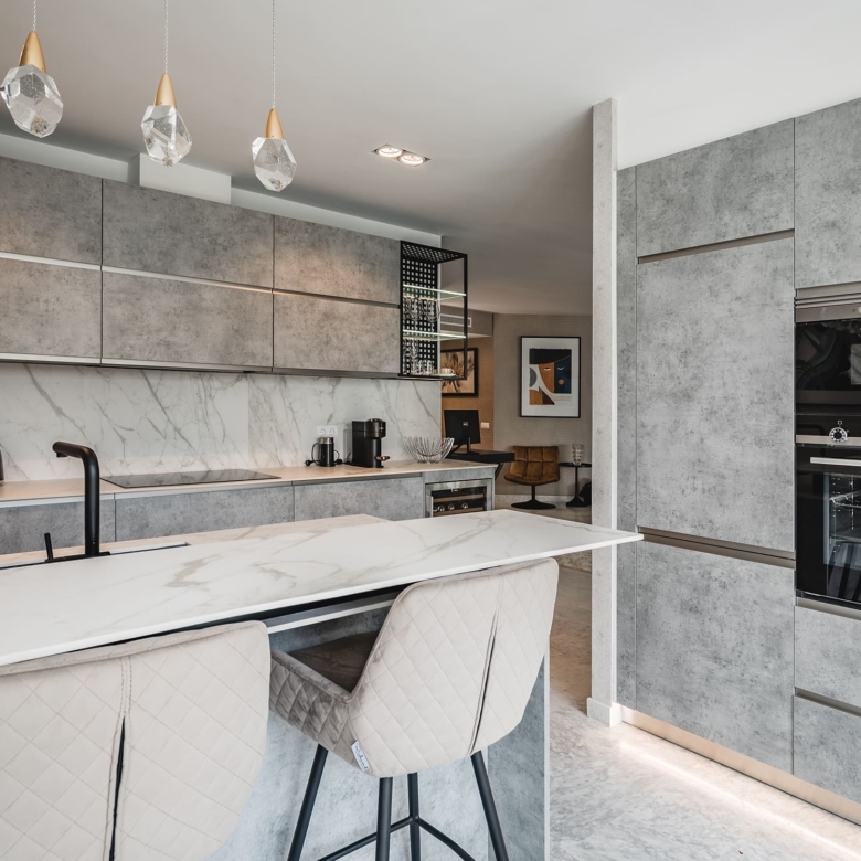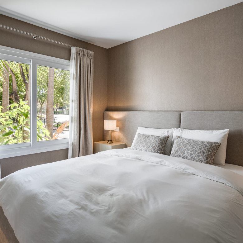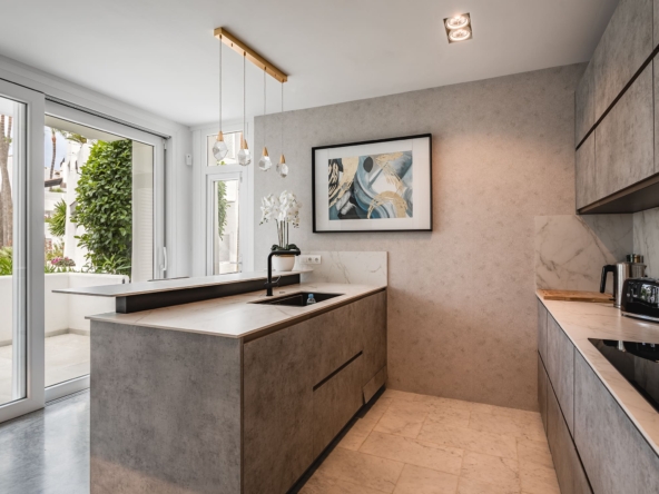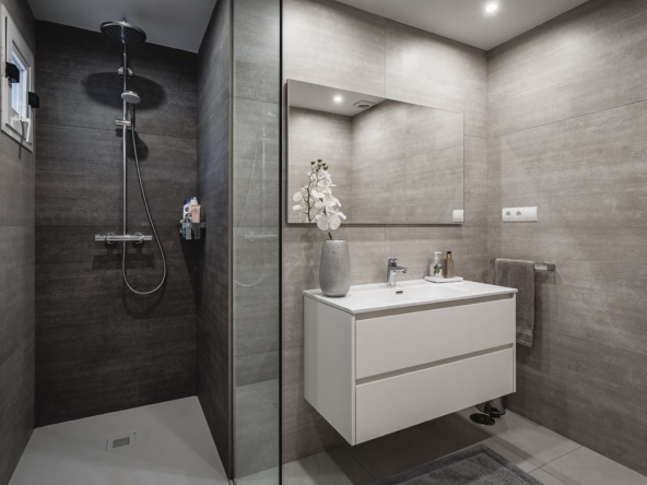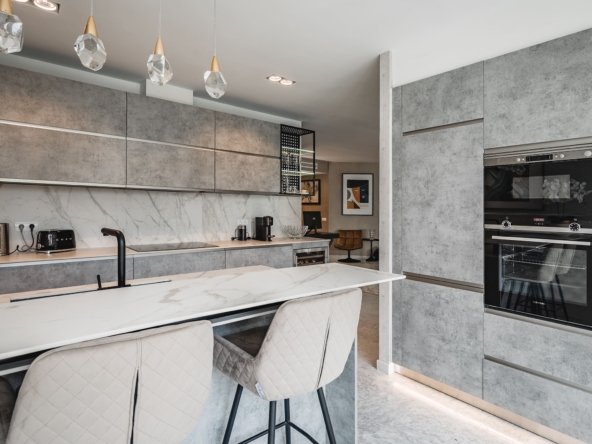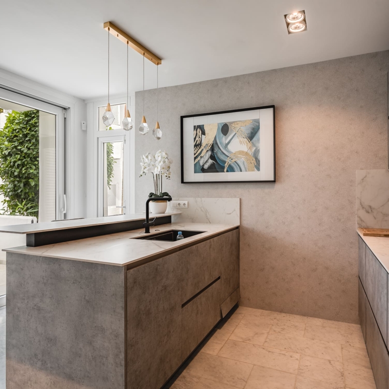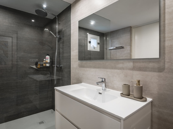 Die Wohnung ist mit einem Fokus auf Komfort und Stil gestaltet. Mit drei Schlafzimmern und drei Bädern bietet sie großzügigen und funktionalen Raum für Familien oder Gruppen. Die Einbauschränke in den Zimmern sorgen für effiziente Aufbewahrung und halten den Raum ordentlich und frei von Unordnung. Die Aufteilung umfasst eine private Garage, die Komfort und Sicherheit für Fahrzeuge gewährleistet. Jedes Detail des Innenraums ist darauf ausgelegt, ein modernes und komfortables Wohnerlebnis zu bieten, mit hochwertigen Oberflächen und einem Design, das das natürliche Licht maximiert.