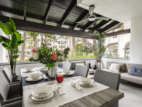 Der Außenbereich der Wohnung ist darauf ausgelegt, das mediterrane Klima optimal zu nutzen. Die private Terrasse bietet einen idealen Raum zum Entspannen im Freien, zum Genießen von Mahlzeiten im Freien oder einfach zum Bewundern des beeindruckenden Meerblicks. Darüber hinaus verfügt der Komplex über weitläufige Gartenanlagen, die eine ruhige und natürliche Umgebung bieten, ideal für morgendliche Spaziergänge oder entspannte Nachmittage. Das Vorhandensein eines Gemeinschaftspools verleiht einen Hauch von Luxus und ermöglicht es den Bewohnern, sich in einer eleganten und gepflegten Umgebung zu erfrischen und zu sozialisieren.