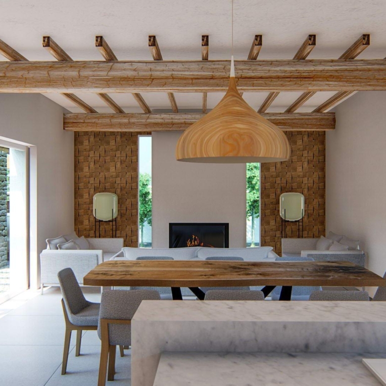 Der private Bereich hat eine größere Dachhöhe als normal und ist mit Holzbalken, Holzwänden und Küchenpaneelen verziert.