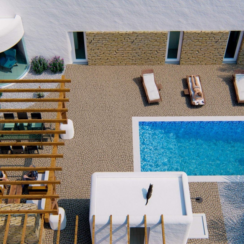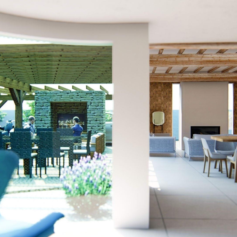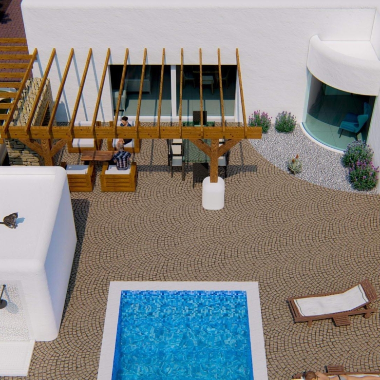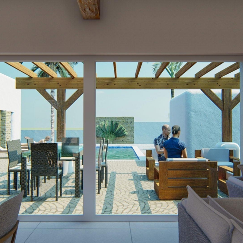 Es gibt ein massives, großes Schiebefenster, das in die Wand eingelassen ist, wenn es geschlossen ist, und das mit einem großen Pergolabereich verbunden ist, der als Puffer zwischen dem Innenraum und der Poolterrasse dient.
