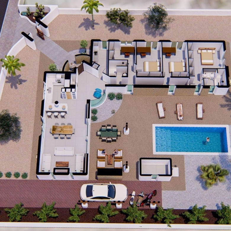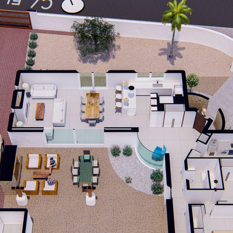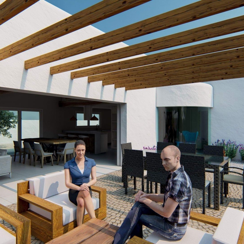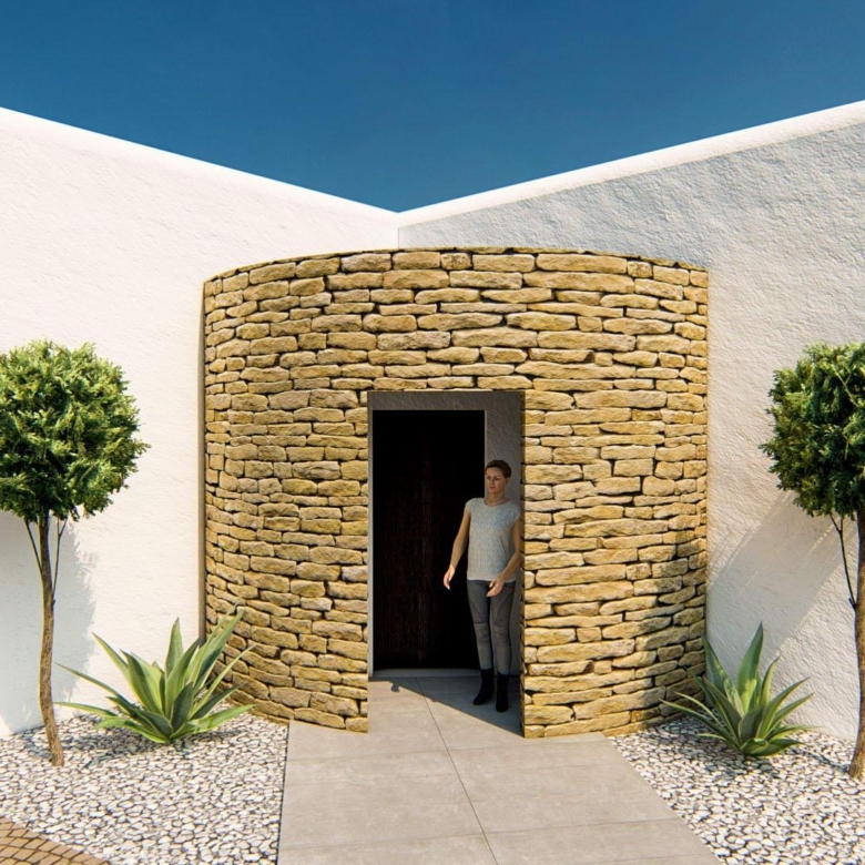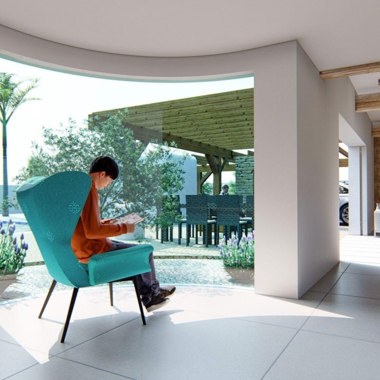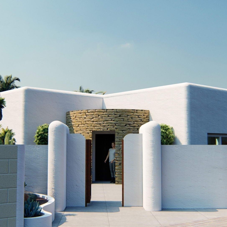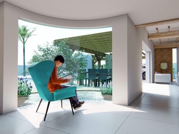 Dies ist ein einstöckiges Haus, das in „L“-Form artikuliert ist, mit einem öffentlichen Volumen (Küche, Wohnzimmer und Esszimmer) und ein öffentliches Volumen (3 Schlafzimmer, 2 Badezimmer, 1 Büro, 1 Waschküche / Hauswirtschaftsraum). Sie sind durch eine runde Halle mit gebogenem Glas verbunden, die den Nutzer beim Betreten des Hauses mit dem Blick auf einen Olivenbaum und den großen, nach Süden ausgerichteten Terrassen-/Poolbereich empfängt.