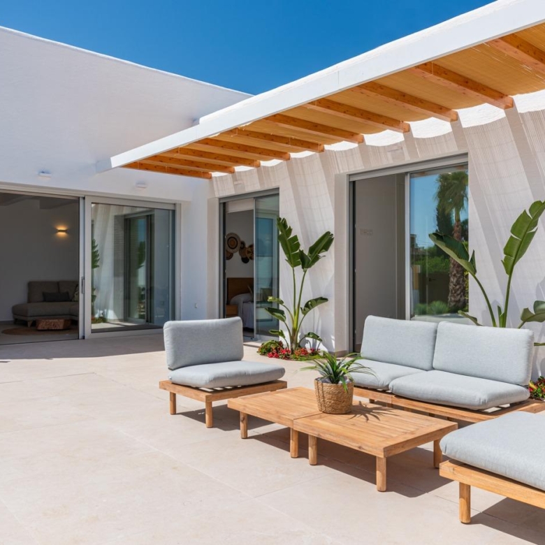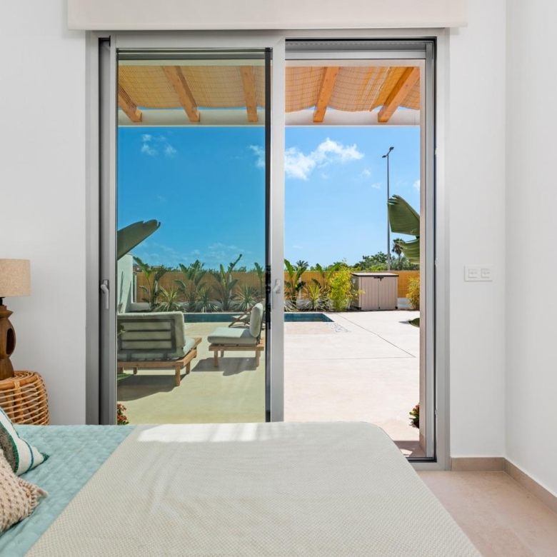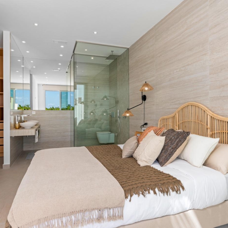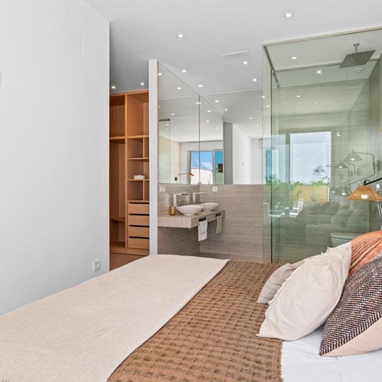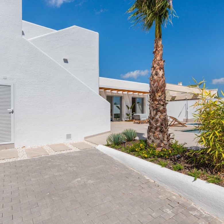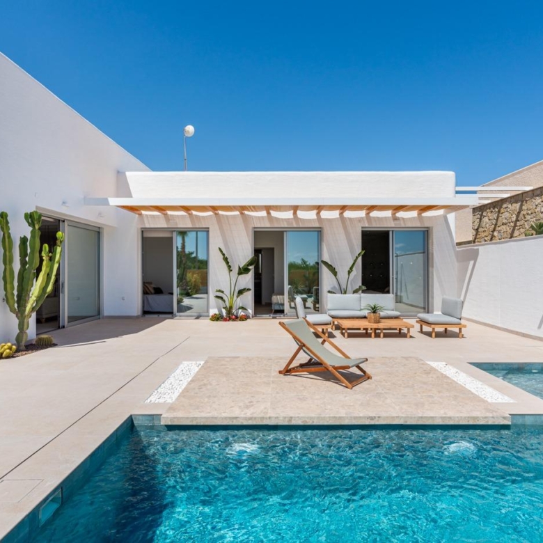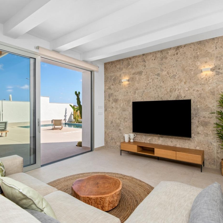 Neubau Villen im modernen Stil mit offener Küche und Wohnbereich, 3 Schlafzimmer, 2 Bäder, privates Grundstück mit Terrasse, Parkplatz und privatem Pool, Garten und eine wunderbare Sonnenterrasse mit herrlichem Blick.