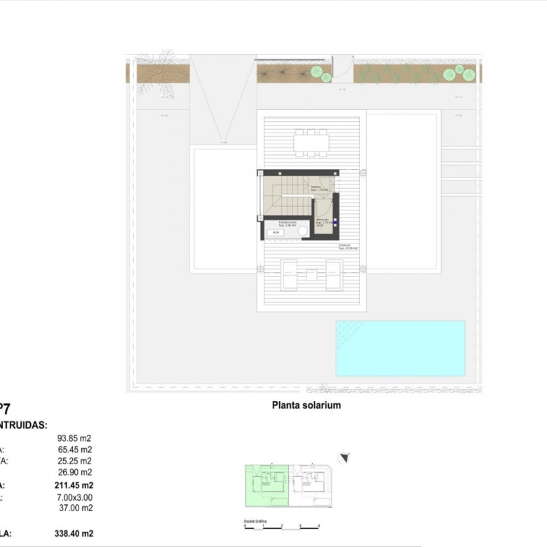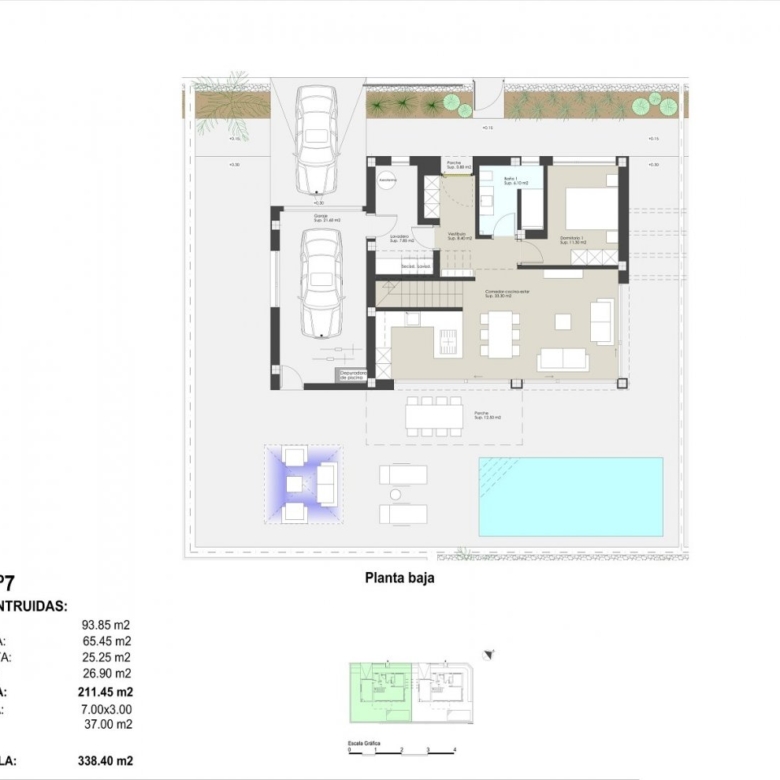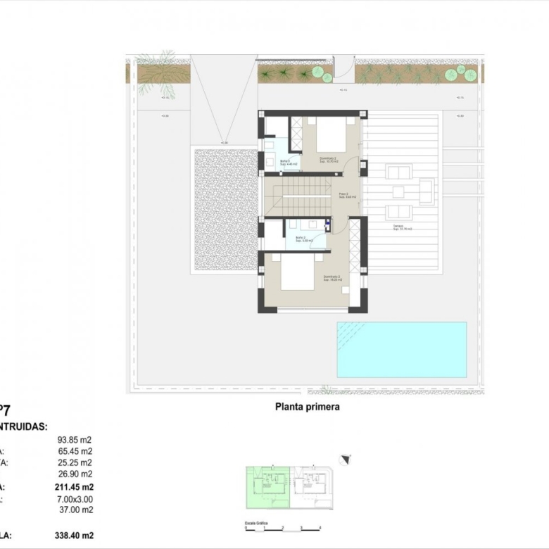 Die Villen haben ein Grundstück von 336m² oder 338m² und eine bebaute Fläche von 211m².