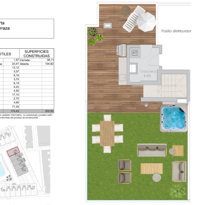 Sie verfügen über einen gemeinsamen Garten, einen Swimmingpool mit strandähnlichem Eingang, ausgestattet mit Duschen und einer großen Holzpergola. Es hat landschaftlich gestaltete Bereiche mit Palmen und Vegetation, von denen alle beleuchtet sind. Im mittleren Teil des Pools gibt es einen flacheren Bereich, in dem sich die Wasserbetten befinden.