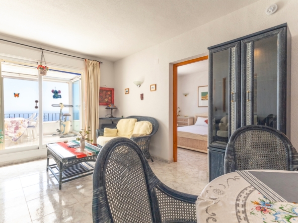 The apartment features a bright and airy living room with large windows that frame the endless Mediterranean views. The semi-open kitchen is both functional and stylish, ideal for daily living or entertaining. The property includes a well-appointed main bathroom, a convenient guest toilet, and a separate storage room for added practicality.