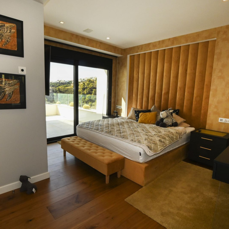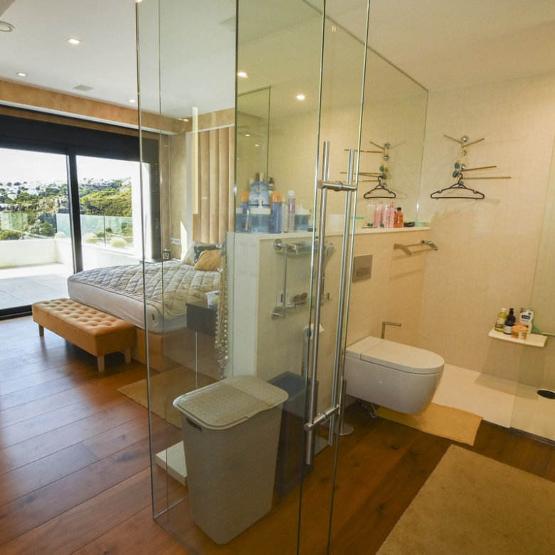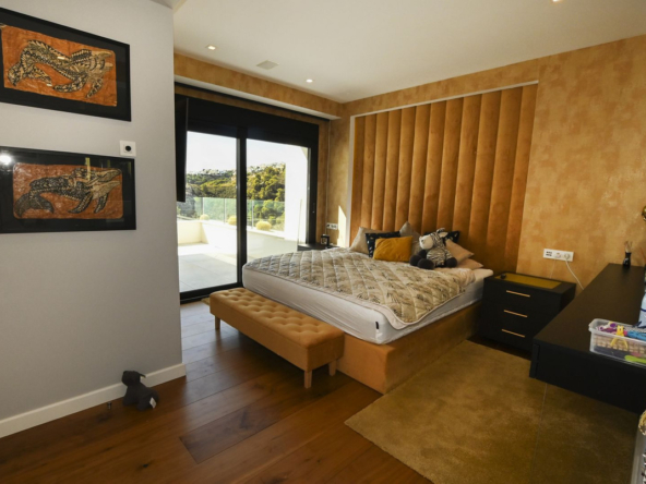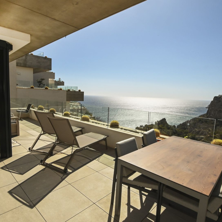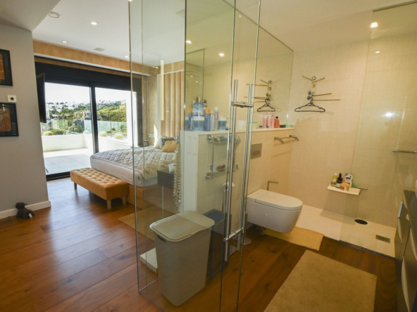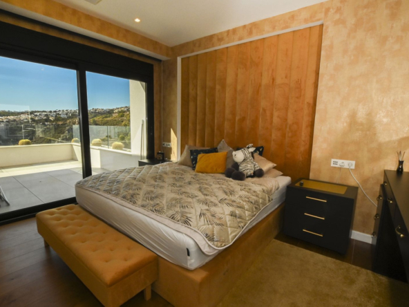 The guest bedroom has direct access to the terrace with sea views. The master bedroom has en-suite bathroom and access to the terrace, creating a luxurious oasis with panoramic ocean and mountain views.