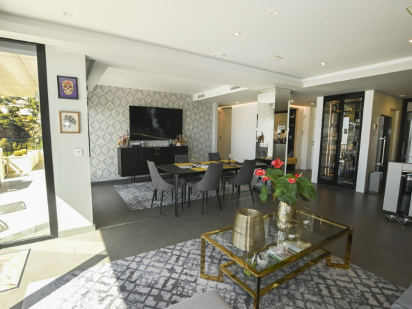 Enjoy breathtaking ocean views from the spacious terrace, which includes an outdoor seating area. Spacious living room with elegant decor. This room has been expanded by removing one of the bedroom walls, making it ideal for family gatherings and entertaining. There is also the option to re-enclose the space to again have a third bedroom.