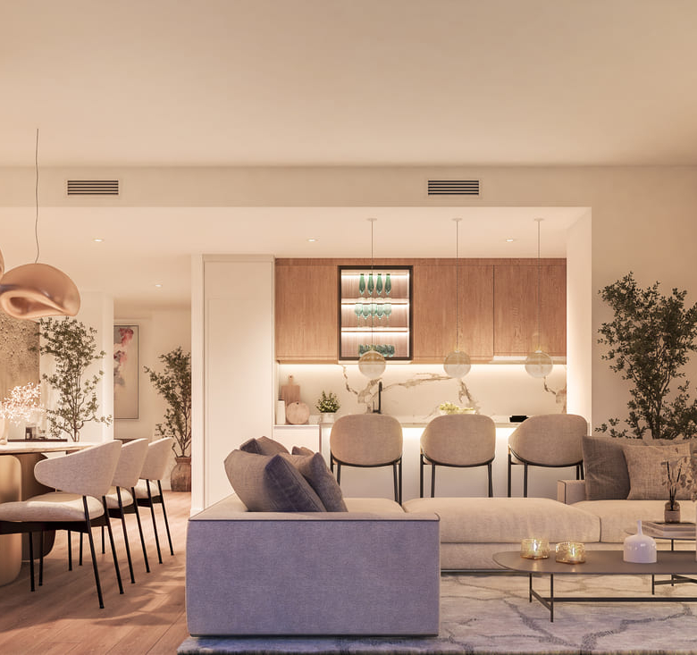 Inside, the properties stand out for their modern and functional design. The apartments and ground floors are available in 2 and 3-bedroom configurations, all with 2 bathrooms. The homes are equipped with floating floors, air conditioning, and underfloor heating, ensuring maximum comfort throughout the year. Built-in wardrobes offer ample storage space, while the video intercom adds an additional level of security and convenience.