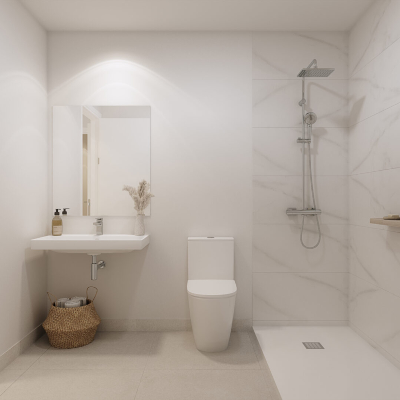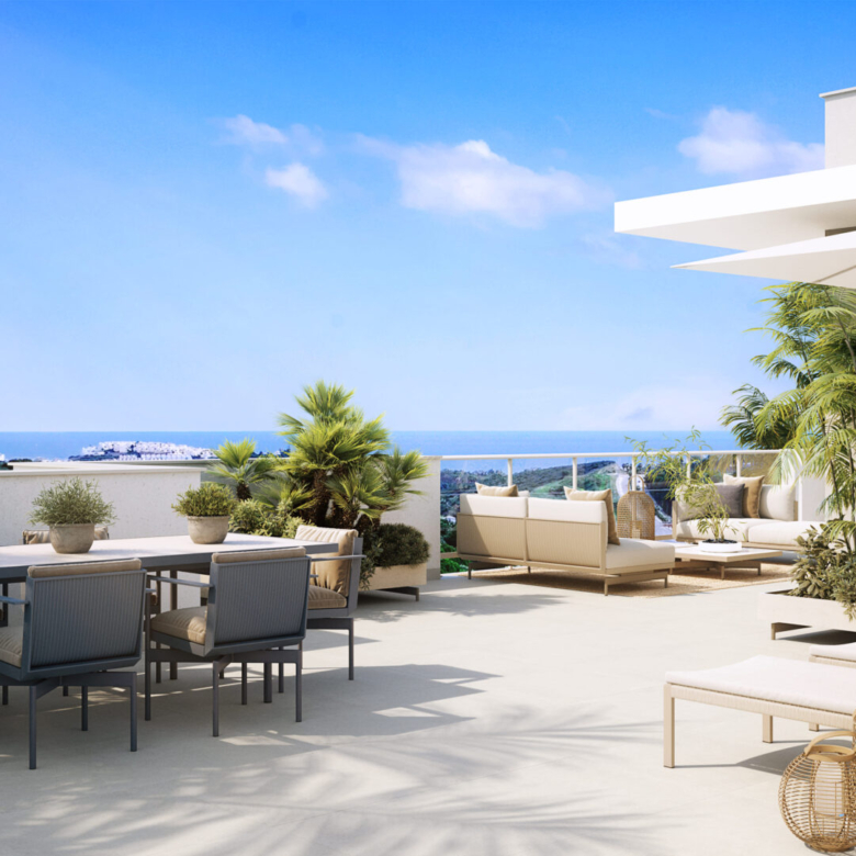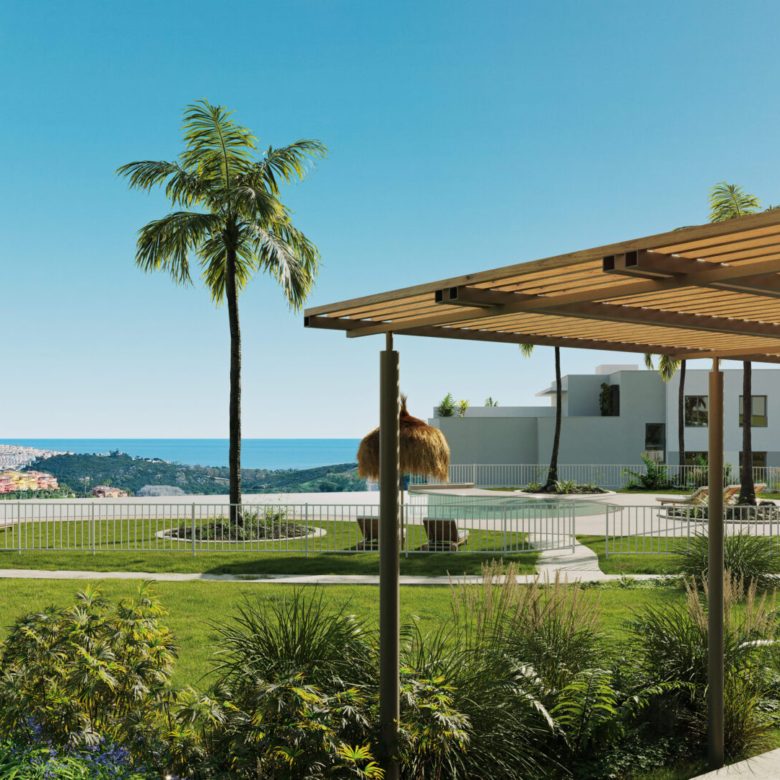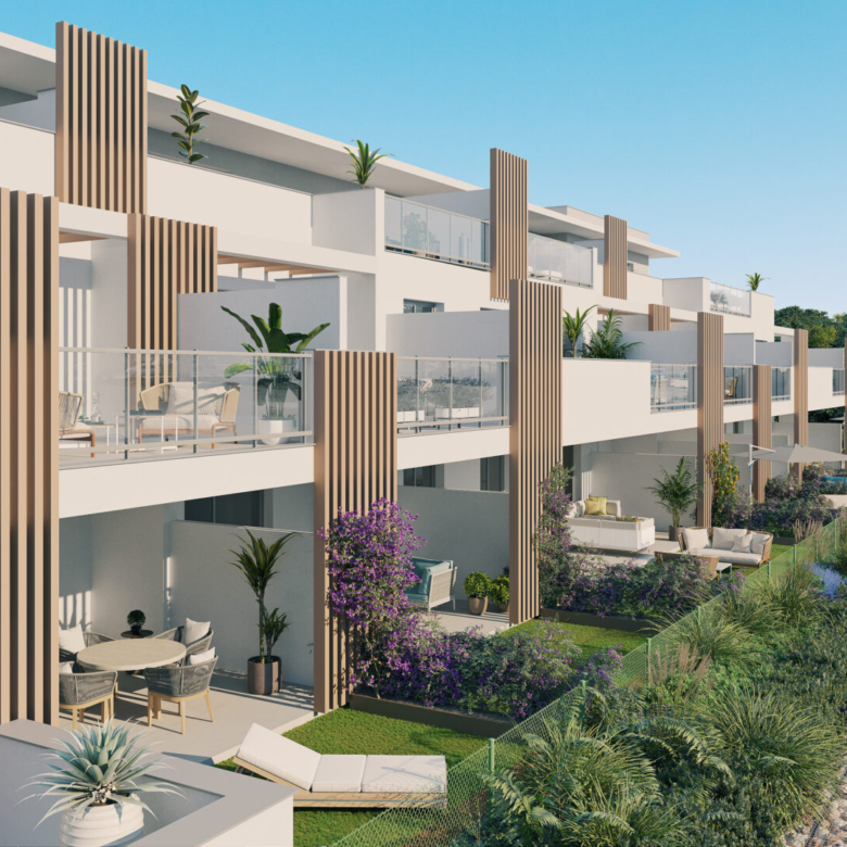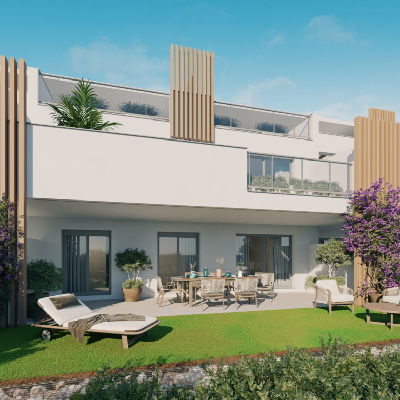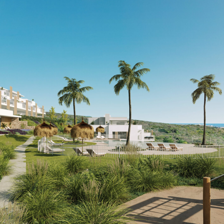 The outdoor areas of this residential complex in Casares are designed to offer an atmosphere of tranquility and enjoyment. Each property features a private terrace, perfect for enjoying the sea views and Mediterranean climate. Additionally, some types include a private garden, providing extra space for outdoor leisure. The community also boasts a communal solarium, ideal for relaxing under the sun. The proximity to the sea and golf course adds additional value to the living experience in this privileged setting.