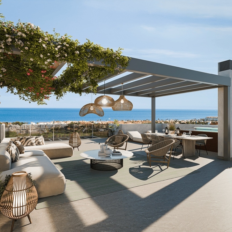 The exteriors of these properties are designed to offer maximum enjoyment of the Mediterranean climate. All homes feature terraces, ideal for relaxing and enjoying the sea views. Additionally, some types include private gardens, perfect for those seeking a personal green space. The penthouses have solariums, providing additional outdoor space for sunbathing or enjoying outdoor gatherings. The proximity to the sea, just 1 km away, allows for beach enjoyment at any time.