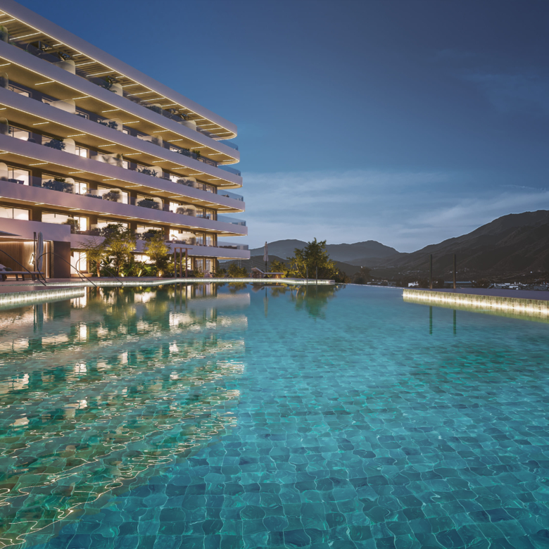The exteriors of this residential complex in Estepona are designed to offer an exceptional outdoor living space. Each property features a terrace, providing a perfect place to enjoy the Mediterranean climate. Additionally, some types include a private garden, ideal for those seeking a personal green space. The inclusion of solariums in certain properties allows for panoramic views and maximizes sun exposure. The proximity to the sea, just 2 km away, adds a special appeal, allowing for the enjoyment of sea breezes and sea views from various locations within the residential complex.