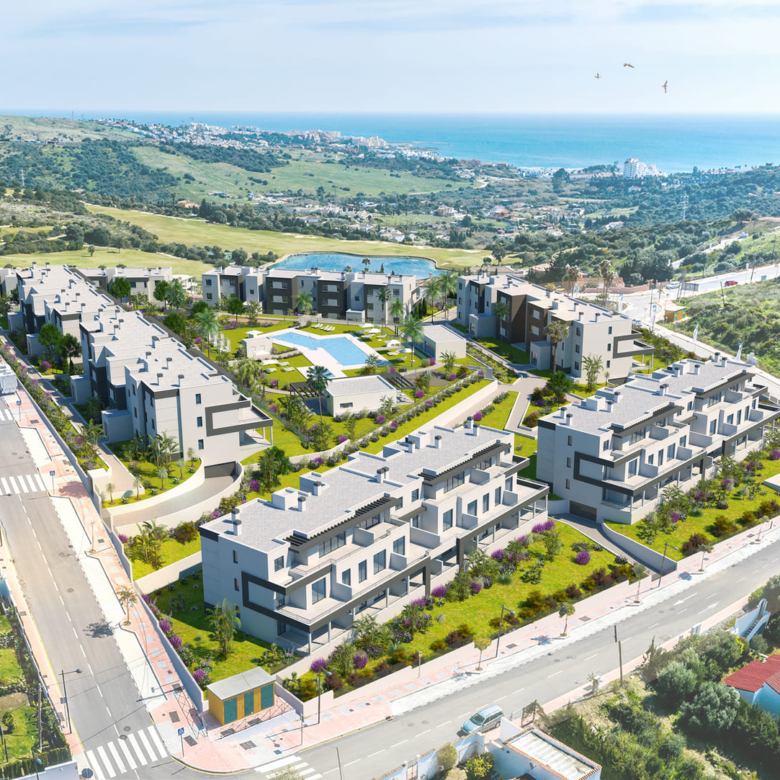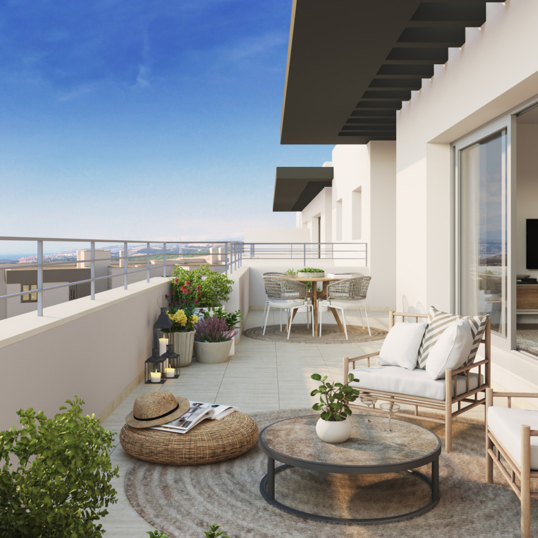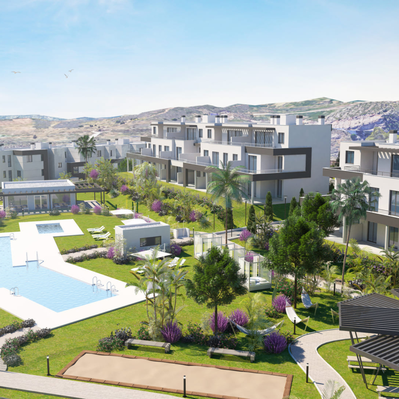 The exteriors of this residential in Estepona are designed to offer an environment of tranquility and natural beauty. Each home features a private terrace, perfect for enjoying outdoor moments and contemplating the surroundings. Additionally, some typologies include a private garden, providing extra space for relaxation and recreation. The proximity to the sea, just 2 km away, allows for coastal walks and water activities, enriching the outdoor living experience.