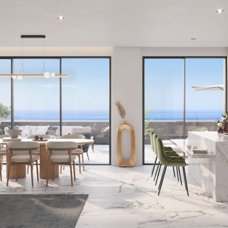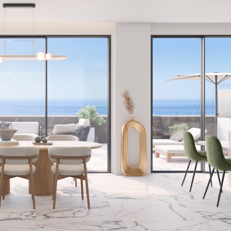 The exterior design of these properties in Estepona focuses on integration with the natural environment and maximizing sea views. The homes feature private terraces, perfect for enjoying the Mediterranean climate and stunning views. Additionally, some types offer private gardens, providing extra space for outdoor leisure. Access to a private garage ensures convenience and security for residents. The choice of high-quality materials, such as porcelain tiles, ensures durability and an elegant finish in all outdoor areas.