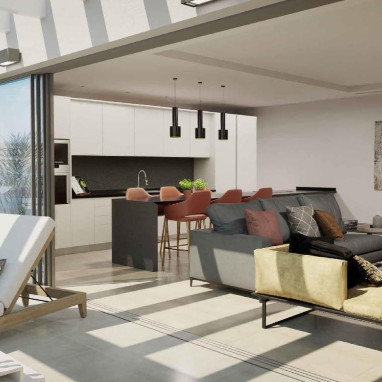 The outdoor areas of these homes have been designed to offer maximum enjoyment of the natural surroundings. Each unit has a private garden, providing a personal green space for relaxation or outdoor activities. Additionally, some properties feature a private pool, ideal for cooling off during warm summer days. The terraces, present in all typologies, offer a perfect place to enjoy sea views and the surroundings. The inclusion of a solarium in certain units allows for maximum sun exposure throughout the year, becoming an additional space for leisure and relaxation.