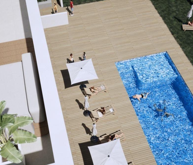 This exclusive development features eight stylish apartments, each with 3 bedrooms and 2 bathrooms. Designed for modern living, the properties boast spacious terraces, private gardens, or solariums to suit different lifestyle needs. The building also includes a ground-floor commercial space and a stunning rooftop (first floor) swimming pool for relaxation and entertainment.
