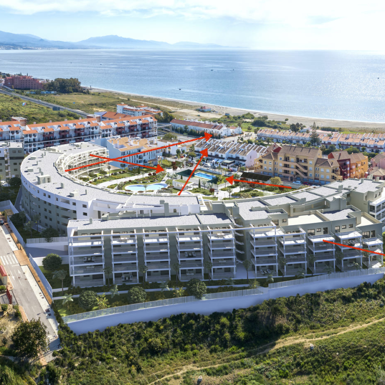 Located in the charming town of Manilva, this residential complex offers a variety of housing options including apartments, ground floors, and penthouses. With a total of 70 properties, each is designed to maximize comfort and functionality. The proximity to the sea, just 1 km away, allows for sea views from many of the homes, providing an idyllic setting for those seeking a coastal lifestyle. The properties are equipped with modern appliances and feature porcelain stoneware floors, ensuring durability and an elegant finish. Additionally, built-in wardrobes offer practical and efficient storage space. The layout options include homes with 2 and 3 bedrooms, all with 2 bathrooms, making them ideal for families and couples seeking extra space.