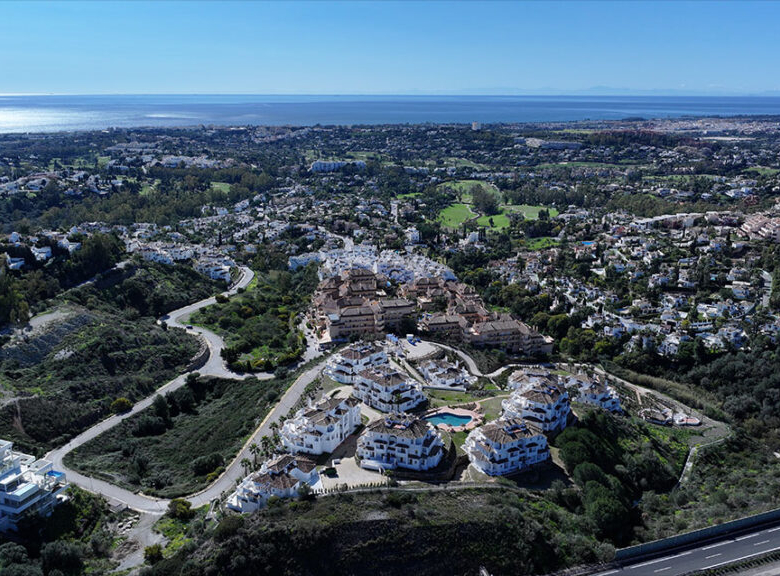 The exterior design of this residential in Marbella has been conceived to harmoniously integrate with the natural surroundings. The properties feature spacious terraces that allow enjoyment of the Mediterranean climate and the surrounding views. Additionally, residents can enjoy extensive landscaped areas that offer an ideal space for rest and relaxation. The modern and elegant architecture combines with high-quality materials, ensuring a timeless aesthetic that complements the beauty of the surrounding landscape.