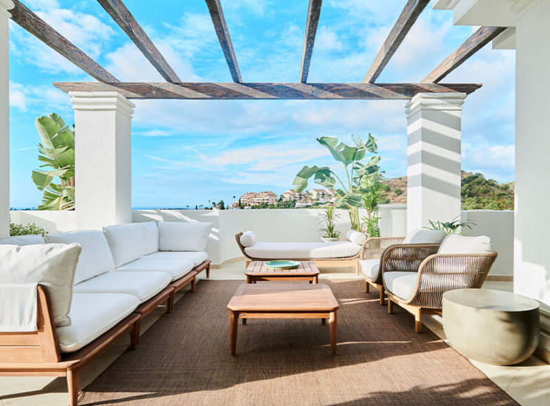 The exterior design of this residential in Marbella has been conceived to harmoniously integrate with the natural surroundings. The properties feature spacious terraces that allow enjoyment of the Mediterranean climate and the surrounding views. Additionally, residents can enjoy extensive landscaped areas that offer an ideal space for rest and relaxation. The modern and elegant architecture combines with high-quality materials, ensuring a timeless aesthetic that complements the beauty of the surrounding landscape.