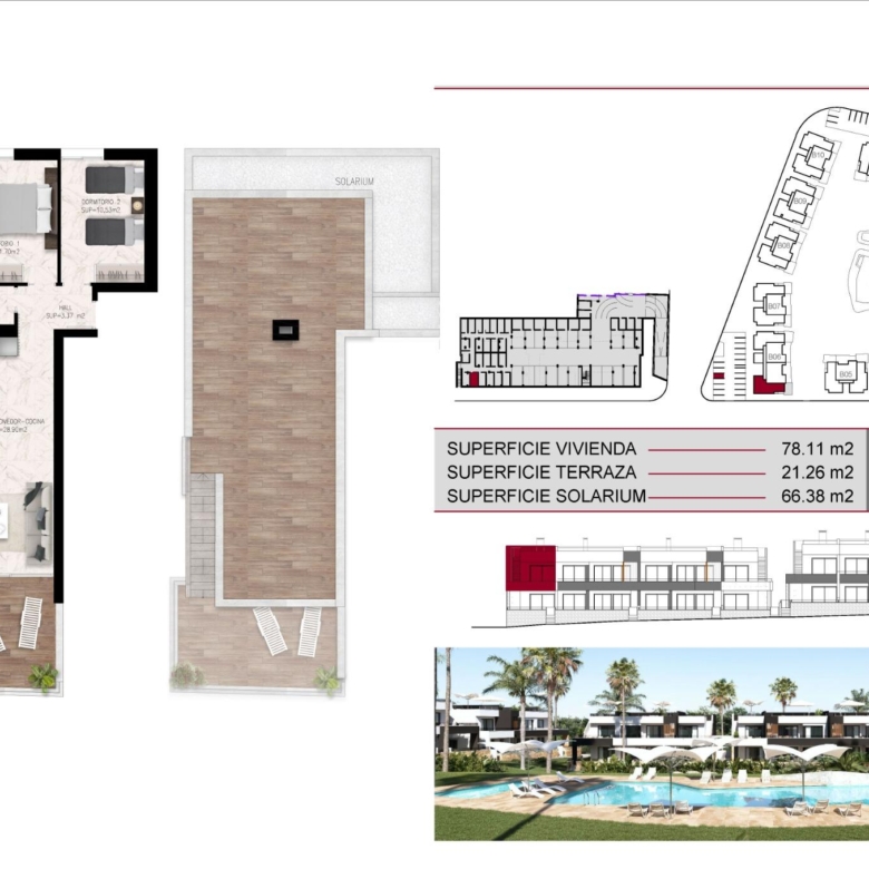 Villas: Independent properties with three bedrooms and three bathrooms, available in one- or two-story layouts. Each villa includes a private pool, a solarium, and parking within the plot. Optional basements are also available.