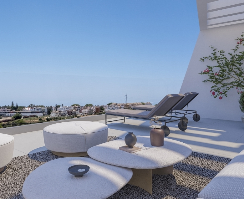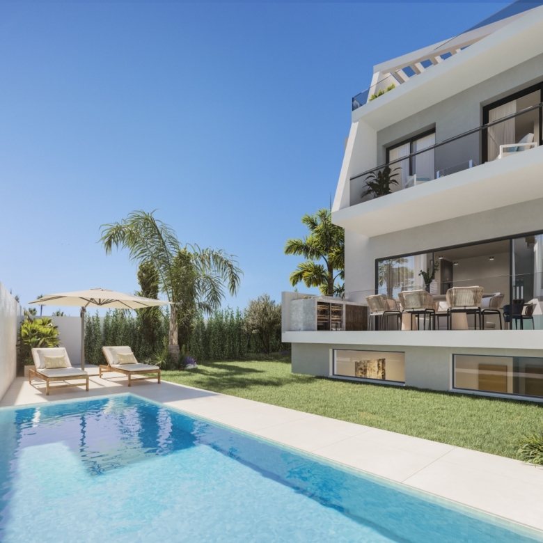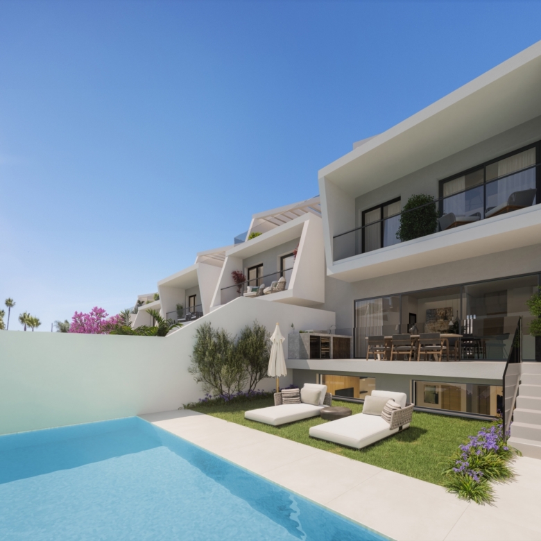 The exteriors of these townhouses in Estepona are designed to enjoy the Mediterranean climate all year round. Each home features a private garden, perfect for creating a personal green space or enjoying outdoor moments. Additionally, the spacious terraces offer an ideal place to relax or share with friends and family. For those seeking a touch of luxury, each townhouse includes a private pool, providing a personal oasis to cool off during the hot summer days. The presence of a solarium adds additional space for sunbathing or enjoying the views of the surroundings.